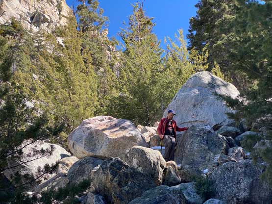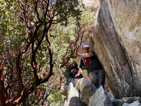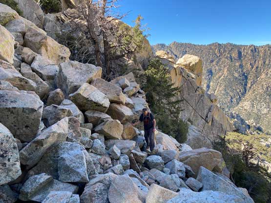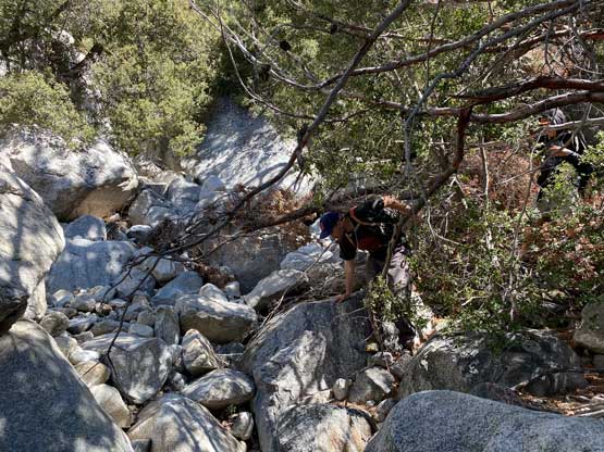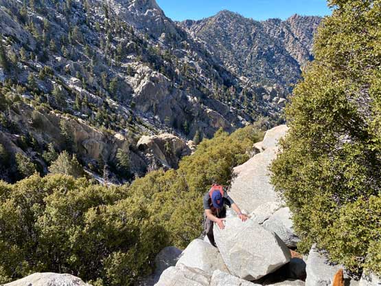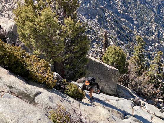 Above the “wall street” the route made a turn to the left and the end of this section we almost got off-route again. I realized the mistake and opted to backtrack to trace the existing GPX tracks. Arthur decided to just bash up the wrong route but eventually had to down-climb to rejoin us. The three of us then climbed a section of steep 3rd class terrain to bypass a large chockstone. The route finally fanned out above this section and the final 200 m grunt to the summit was quite a slog. Again, we were mostly boulder-hopping and the route-finding requirement was never-ending, even on easier sections. This was the first summit we climbed in this trip that had no trees on top, meaning the first and the only 360-degree panorama we got in Baja California.