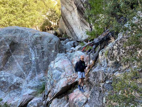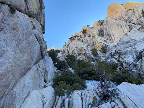 We had decided to break this ascent properly into 3 days so the objective for Day 2 was to tag the summit, and get back to camp. I thought this would be quite a lame day considering the distance and elevation gain, but it turned out much harder than anticipated. Doug and I opted to start at daybreak but Arthur would start a few hours later to catch us up. We were mostly able to follow the trail through the lower bushes but the trail forked here and there making so much confusion. I had to constantly consult with the GPS map but the GPS does not work too well in the micro-terrain of gullies. Eventually we ended up ascending too far on climber’s right and completely lost the trail. Some GPX tracks that we downloaded continued ascending the right hand side of the gully but we decided to correct this mistake by dropping a short ways into the main gully and the going indeed became easier. This was at around 2400 m elevation zone. The progress up to this point was much slower than I thought and I started to become tired of looking at the phone’s screen. For the next while we mostly stayed in the gully and were able to mostly follow the path but we did get off-route again a few times. Arthur ended up getting off-route from basically the start of the climb but he was good enough to just scramble the low 5th class rocks and bash through the dense bushes on the rib to the north. Arthur eventually caught up with Doug and I just above the infamous “wall street”. This section of class 3 granite slabs were quite fun.