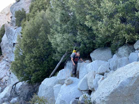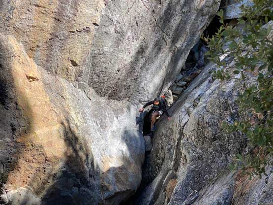 Crawling down the 3rd class ramp to bypass that impassible chockstone