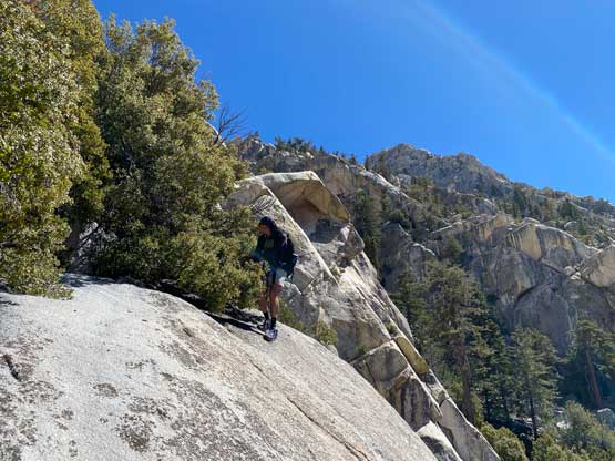 We had decided to break this ascent properly into 3 days so the objective for Day 2 was to tag the summit, and get back to camp. I thought this would be quite a lame day considering the distance and elevation gain, but it turned out much harder than anticipated. Doug and I opted to start at daybreak but Arthur would start a few hours later to catch us up. We were mostly able to follow the trail through the lower bushes but the trail forked here and there making so much confusion. I had to constantly consult with the GPS map but the GPS does not work too well in the micro-terrain of gullies. Eventually we ended up ascending too far on climber’s right and completely lost the trail. Some GPX tracks that we downloaded continued ascending the right hand side of the gully but we decided to correct this mistake by dropping a short ways into the main gully and the going indeed became easier. This was at around 2400 m elevation zone. The progress up to this point was much slower than I thought and I started to become tired of looking at the phone’s screen. For the next while we mostly stayed in the gully and were able to mostly follow the path but we did get off-route again a few times. Arthur ended up getting off-route from basically the start of the climb but he was good enough to just scramble the low 5th class rocks and bash through the dense bushes on the rib to the north. Arthur eventually caught up with Doug and I just above the infamous “wall street”. This section of class 3 granite slabs were quite fun.