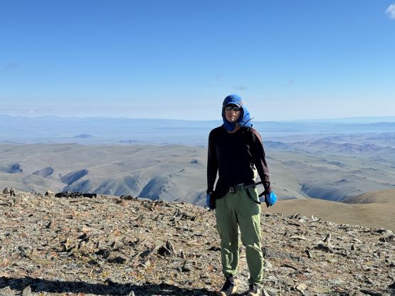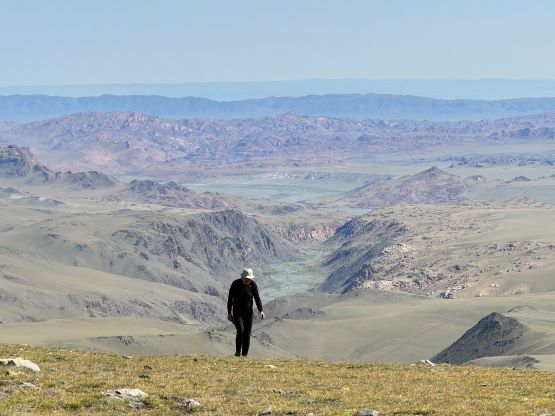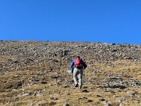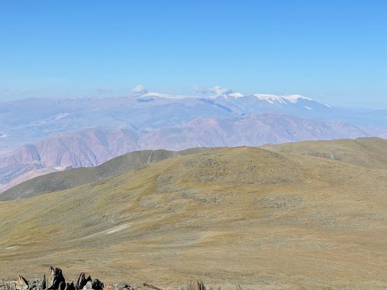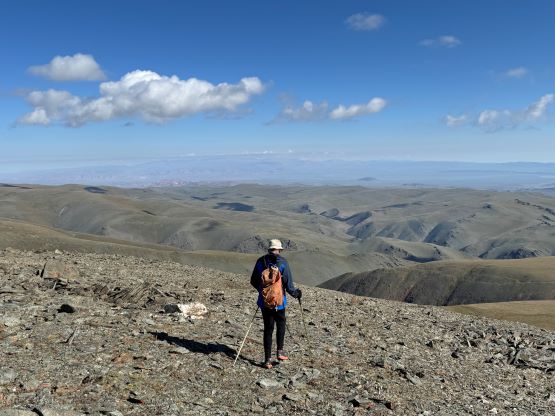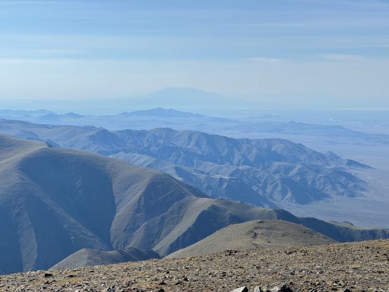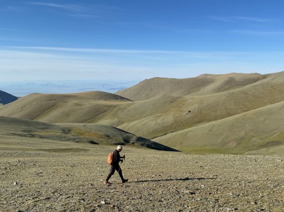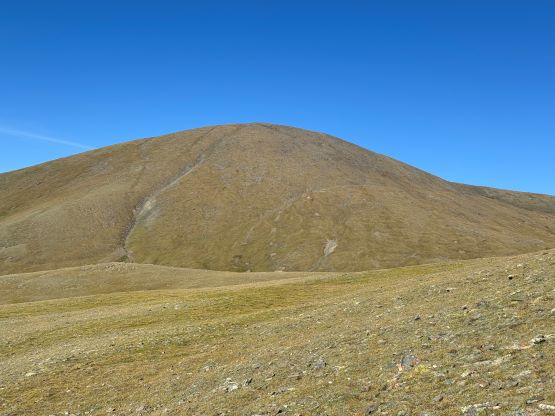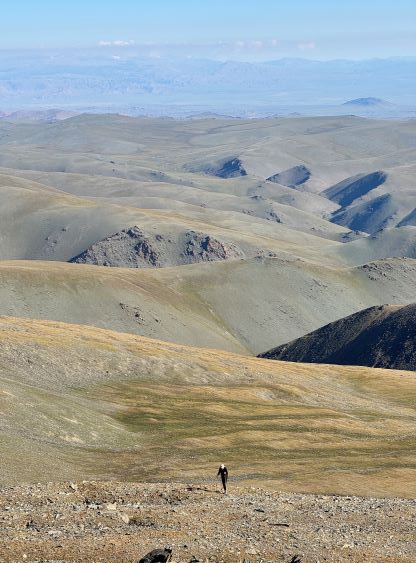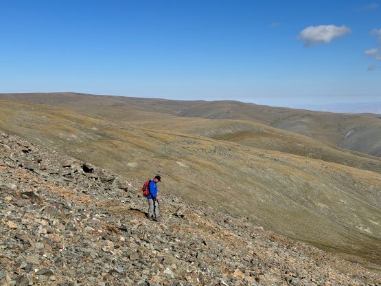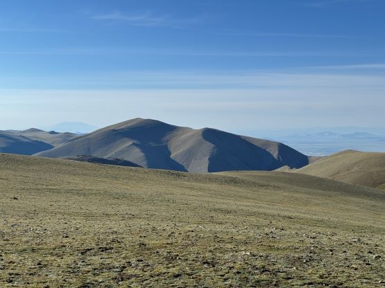 The following morning we woke up sort of naturally as the weather seemed stable. We left the basecamp intact and the driver drove the guide, Petter and myself all the way up to the 2800-m saddle to start our hike. This was shaping up to be one of, if not the easiest Ultra in Mongolia. The driver then drove back down to the basecamp. The true summit was at least three bumps away but it seemed like we could bypass most of them. The plan was to side-hill across on the south-facing slopes and the guide seemed to understand. The three of us ended up taking slightly different paths but the general bearing was the same. We firstly aimed at a shallow saddle at 2950 m and then traversed across the next two bumps using a combination of open grassy slopes and game trails. The final 300-m ascent of the true summit was a bit tedious and the grass eventually gave way to rubble but it wasn’t too painful. The guide and I continued south beyond the summit to check out the next bump but it was clear that the first one was the highest.