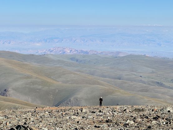 The following morning we woke up sort of naturally as the weather seemed stable. We left the basecamp intact and the driver drove the guide, Petter and myself all the way up to the 2800-m saddle to start our hike. This was shaping up to be one of, if not the easiest Ultra in Mongolia. The driver then drove back down to the basecamp. The true summit was at least three bumps away but it seemed like we could bypass most of them. The plan was to side-hill across on the south-facing slopes and the guide seemed to understand. The three of us ended up taking slightly different paths but the general bearing was the same. We firstly aimed at a shallow saddle at 2950 m and then traversed across the next two bumps using a combination of open grassy slopes and game trails. The final 300-m ascent of the true summit was a bit tedious and the grass eventually gave way to rubble but it wasn’t too painful. The guide and I continued south beyond the summit to check out the next bump but it was clear that the first one was the highest.