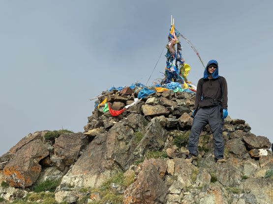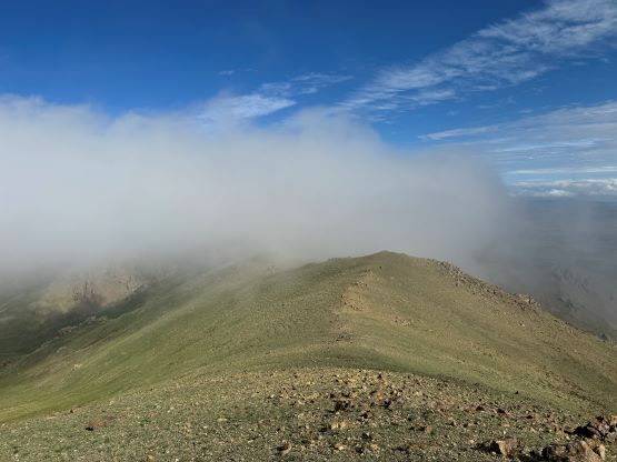 The weather was improving and supposed to be even better towards the evening so I decided that we should make the summit bid right now, even though it was getting late in the day. Petter needed some convincement but reluctantly agreed and Manlai would also go up with us. This turned out to be a critical decision but not due to the various factors that I had thought about. Waiting for the next morning would not be possible in this case and we might have lost this peak if we didn’t opt to go right away, but more on that later. We still had to traverse westwards into the next gully system but only for 500 m horizontal distance, and then easily plodded up this valley. Petter was setting a blistering pace and Manlai was trying really hard to keep up. I didn’t understand because the summit was still engulfed in the clouds and the forecast was calling for more promising weather later in the evening, so I on purposely slowed down and did the rest of the ascent alone, but behind the team. The route positioned us onto the SE Ridge of the eastern peak so it naturally made sense to tag this P40m eastern sub-summit. There wasn’t much to see up there due to the clouds so I quickly made my way over to the true summit where Petter and Manlai had been waiting for at least 15 minutes. I then decided to tag the western sub-peak as well mostly because Rob and Deividas had gone there. It was a few meters lower based on their observation, which could be confirmed by my GPS readings, but the weather finally improved at this stage of the day so I was definitely happy about this seemingly meaningless side trip.