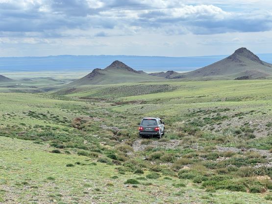 Again I didn’t take Devidas and Rob’s “beta” for granted and went back to the maps. I had proposed an attack from the SW that offers the least amount of hiking, but such would involve driving a longer distance on unpaved roads. I was actually planning to direct our driver towards that way but the reality didn’t quite match what I’d seen on the satellite images, probably due to the images being old. The satellite images didn’t even fully show the paved highway so we missed a critical turn. That’s okay as we would then take Rob and Deividas’ route from the SE. Gangaa and Manlai would be happy about this decision because we were maximizing the driving distance on this paved highway. Rob’s GPX track was mostly correct but we opted to take a variation near the end, by driving up a paralleling gulch further to the east. This would give us a higher starting point and we surely had no issues driving all the way to 2350 m elevation. The problem was then we were positioned a few kilometers to the east of the route. Thankfully our skillful and determined drivers were able to drove us at least 2 km westwards by crossing several troublesome gullies, so now we had parked ourselves much closer than Rob and Deividas’ starting point, from both elevation and distance perspectives.