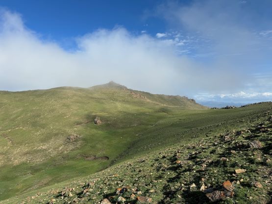 The weather was improving and supposed to be even better towards the evening so I decided that we should make the summit bid right now, even though it was getting late in the day. Petter needed some convincement but reluctantly agreed and Manlai would also go up with us. This turned out to be a critical decision but not due to the various factors that I had thought about. Waiting for the next morning would not be possible in this case and we might have lost this peak if we didn’t opt to go right away, but more on that later. We still had to traverse westwards into the next gully system but only for 500 m horizontal distance, and then easily plodded up this valley. Petter was setting a blistering pace and Manlai was trying really hard to keep up. I didn’t understand because the summit was still engulfed in the clouds and the forecast was calling for more promising weather later in the evening, so I on purposely slowed down and did the rest of the ascent alone, but behind the team. The route positioned us onto the SE Ridge of the eastern peak so it naturally made sense to tag this P40m eastern sub-summit. There wasn’t much to see up there due to the clouds so I quickly made my way over to the true summit where Petter and Manlai had been waiting for at least 15 minutes. I then decided to tag the western sub-peak as well mostly because Rob and Deividas had gone there. It was a few meters lower based on their observation, which could be confirmed by my GPS readings, but the weather finally improved at this stage of the day so I was definitely happy about this seemingly meaningless side trip.