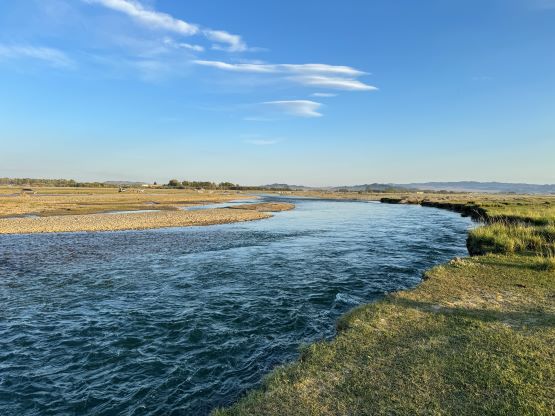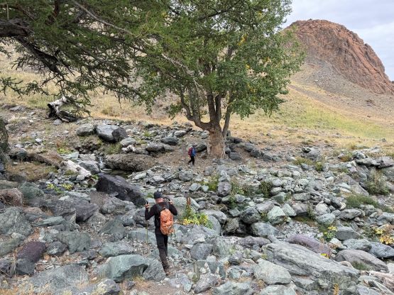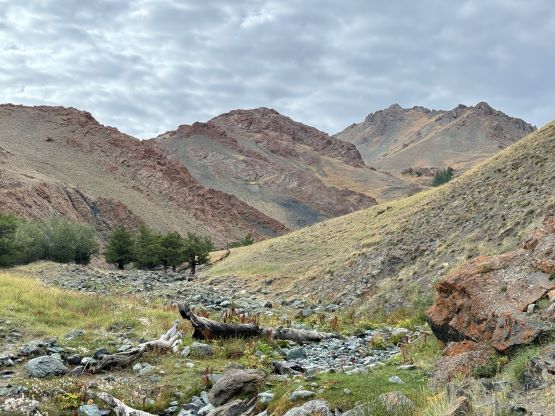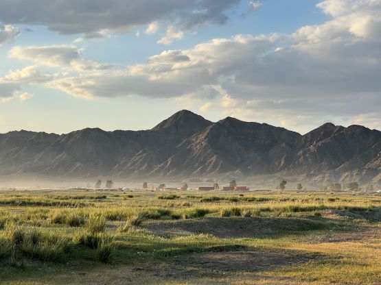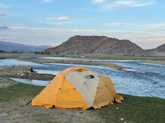 I was skeptical about the feasibility despite the promises because sometimes the guiding companies had no clue about the location of “true summits” of their targeting objectives. This was not the case for us, but there were plenty of other, foreseeable issues. There were together one head guide, two climbing guides (one also being a driver), one additional driver, two Landcruisers in addition to Petter and myself, as well as soldiers that were patrolling the area and everyone, human or machine, had been stretching to their respective limits to make this a success ascent. Petter and I decided to skip some details including the name of this company and our guides because we don’t want anyone in this team get in trouble. After driving out of Munkh Khairkhan we located ourselves in the small border town called Bulgan for the night. But prior to arrival we stopped at another town to obtain our permit to enter this border zone. We got denied to climb to the summit of Dünkheger but we did get ourselves permitted to at least visit the area. We hoped that the soldiers could be somewhat flexible upon our arrival, which might or might not be the case. Honestly our chance of success was not high, but we were already there and we had no better peak to do so why not give it a try. The plan at Bulgan was to find us a guesthouse but due to the change of dates the houses were sold out. We spent at least 2 hours trying to make some decisions but eventually settled on the camping option, which was the cheapest but the least pleasant. Thankfully the view beside the river was great and there was enough reception for me to fully catch up with the trip reports. The night was too hot on the desert floor so I needed to sleep with the tent doors open, but unfortunately a dust storm blew in and I woke up with everything in the tent covered in a layer of sand.