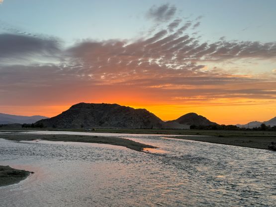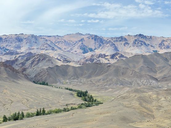 I was skeptical about the feasibility despite the promises because sometimes the guiding companies had no clue about the location of “true summits” of their targeting objectives. This was not the case for us, but there were plenty of other, foreseeable issues. There were together one head guide, two climbing guides (one also being a driver), one additional driver, two Landcruisers in addition to Petter and myself, as well as soldiers that were patrolling the area and everyone, human or machine, had been stretching to their respective limits to make this a success ascent. Petter and I decided to skip some details including the name of this company and our guides because we don’t want anyone in this team get in trouble. After driving out of Munkh Khairkhan we located ourselves in the small border town called Bulgan for the night. But prior to arrival we stopped at another town to obtain our permit to enter this border zone. We got denied to climb to the summit of Dünkheger but we did get ourselves permitted to at least visit the area. We hoped that the soldiers could be somewhat flexible upon our arrival, which might or might not be the case. Honestly our chance of success was not high, but we were already there and we had no better peak to do so why not give it a try. The plan at Bulgan was to find us a guesthouse but due to the change of dates the houses were sold out. We spent at least 2 hours trying to make some decisions but eventually settled on the camping option, which was the cheapest but the least pleasant. Thankfully the view beside the river was great and there was enough reception for me to fully catch up with the trip reports. The night was too hot on the desert floor so I needed to sleep with the tent doors open, but unfortunately a dust storm blew in and I woke up with everything in the tent covered in a layer of sand.