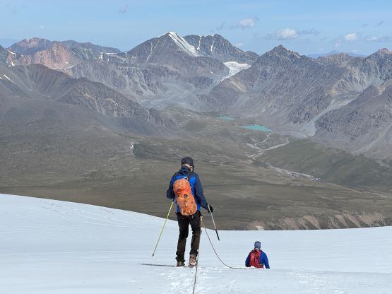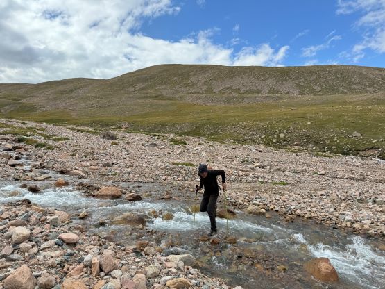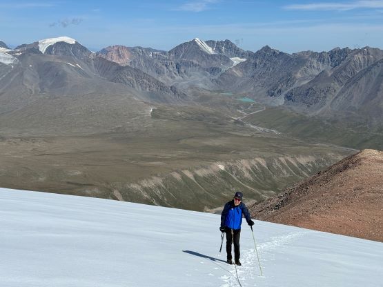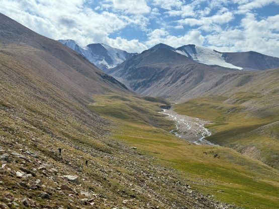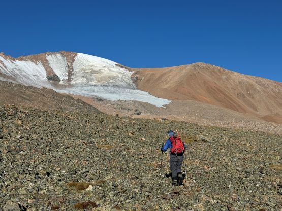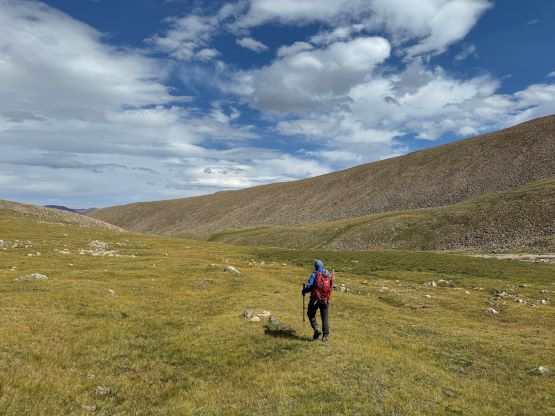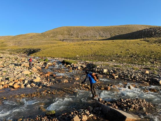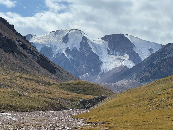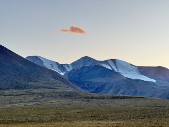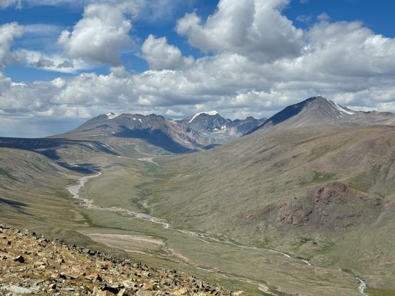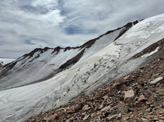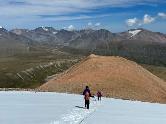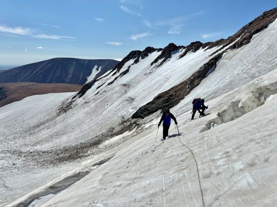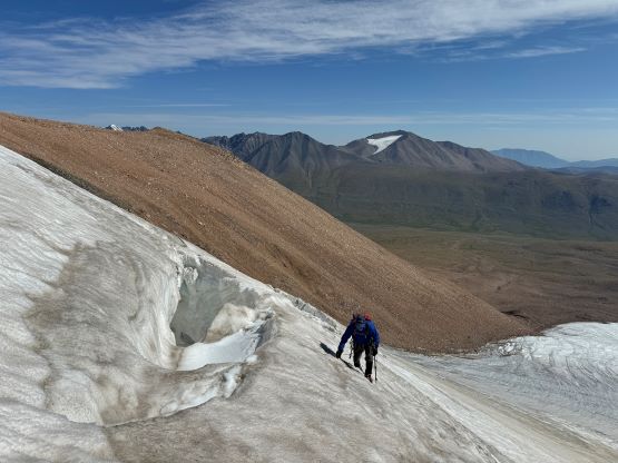 The next morning we decided to wake up and have breakfast at daybreak and start the long plod at sunrise. In retrospect we should have given the weather more respect as there are frequent afternoon/evening thunderstorms in this part of the country. We ended up finishing the trip just moments before a big store blew in so we got lucky in the end. In any case Petter and I followed out guide Manlai across some open terrain and then descended into the main valley separating our camp with the objective. This descended required almost 100 m elevation loss and there’s a river to cross afterwards. We were able to hop across on boulders but careful route-finding was needed. Adam decided to take his own way but turned around at the river crossing as he was still feeling the altitude and the long lasting lung issues that could or could not be “long Covid”, but nobody knows. Adam ended up having to quit this entire trip afterwards as most, if not all of these Mongolian objectives are at or above 3000 m altitude. The three of us continued and made a rising traverse out of the valley on mostly grassy slopes to the broad ridge leading towards Must Peak’s east facing glacier. The final section before reaching the glacier was very tedious due to unstable boulders on some undulating moraine. I decided to wear trail-runners all the way across these painful moraines to the edge of the glacier and we did our first formal “stop” there to don some gears. I ditched the trail-runners and donned mountaineering boots, crampons and harness, but the decision was not use rope up until absolutely needed.