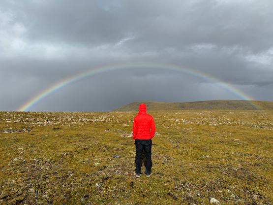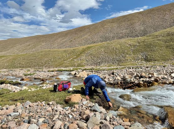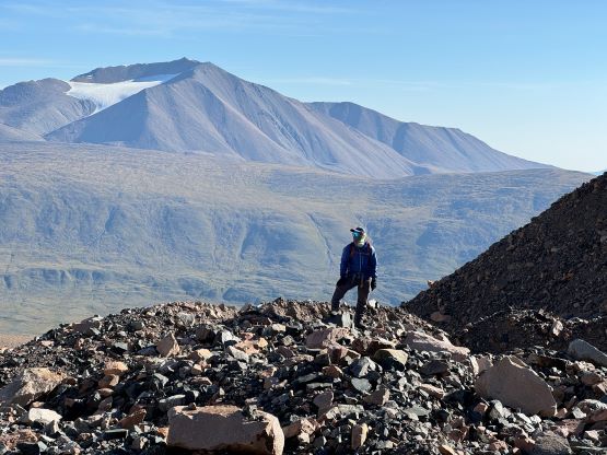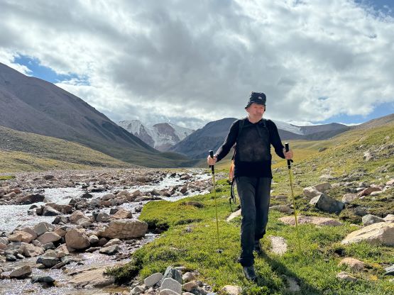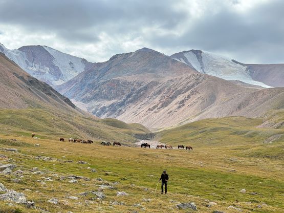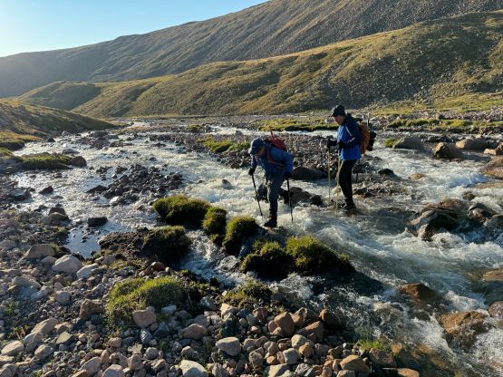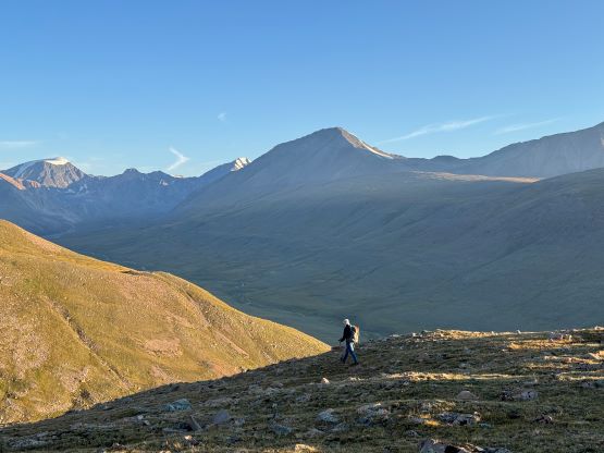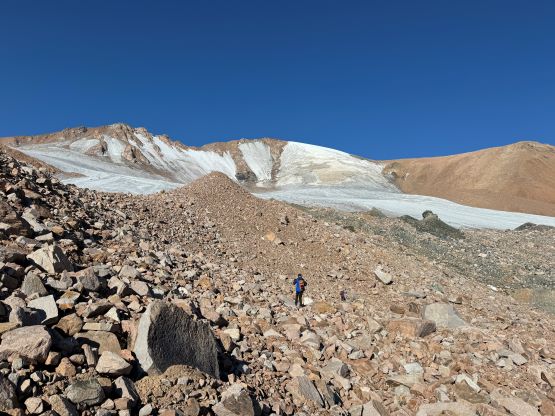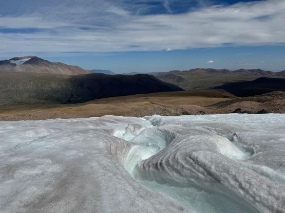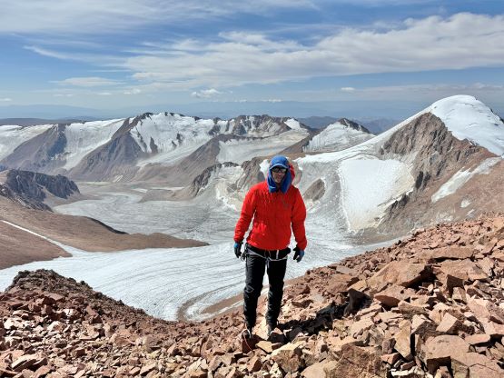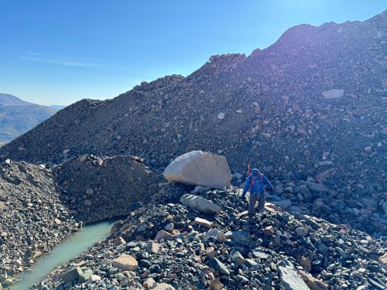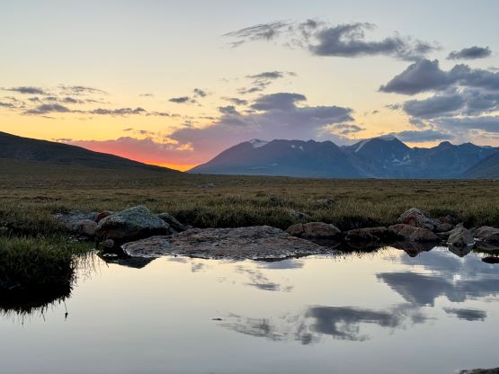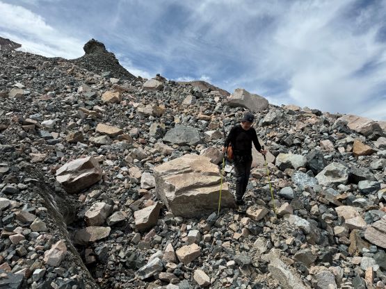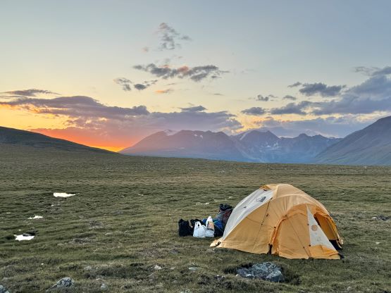 The next morning we decided to wake up and have breakfast at daybreak and start the long plod at sunrise. In retrospect we should have given the weather more respect as there are frequent afternoon/evening thunderstorms in this part of the country. We ended up finishing the trip just moments before a big store blew in so we got lucky in the end. In any case Petter and I followed out guide Manlai across some open terrain and then descended into the main valley separating our camp with the objective. This descended required almost 100 m elevation loss and there’s a river to cross afterwards. We were able to hop across on boulders but careful route-finding was needed. Adam decided to take his own way but turned around at the river crossing as he was still feeling the altitude and the long lasting lung issues that could or could not be “long Covid”, but nobody knows. Adam ended up having to quit this entire trip afterwards as most, if not all of these Mongolian objectives are at or above 3000 m altitude. The three of us continued and made a rising traverse out of the valley on mostly grassy slopes to the broad ridge leading towards Must Peak’s east facing glacier. The final section before reaching the glacier was very tedious due to unstable boulders on some undulating moraine. I decided to wear trail-runners all the way across these painful moraines to the edge of the glacier and we did our first formal “stop” there to don some gears. I ditched the trail-runners and donned mountaineering boots, crampons and harness, but the decision was not use rope up until absolutely needed.