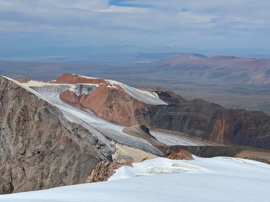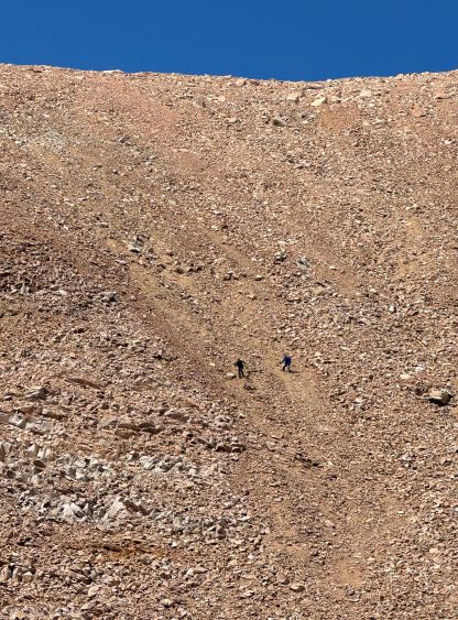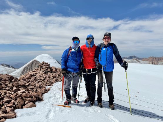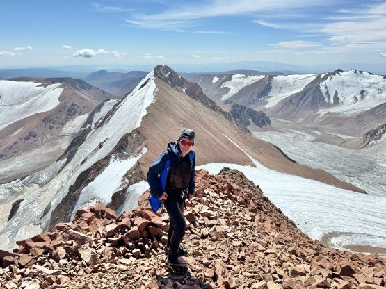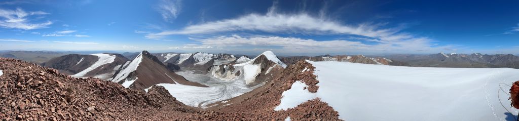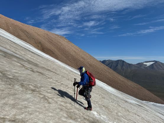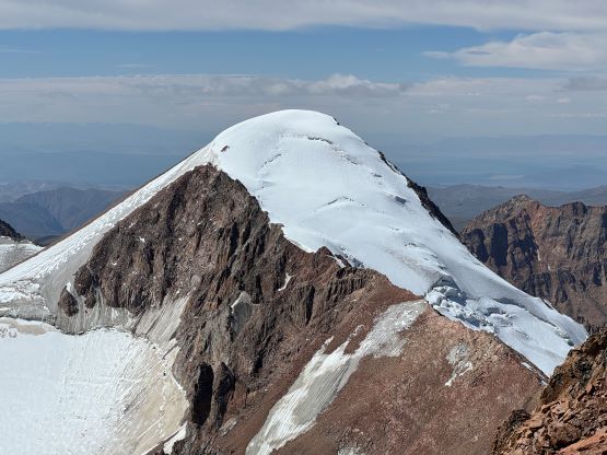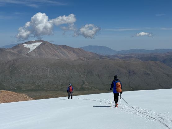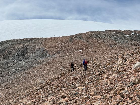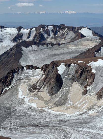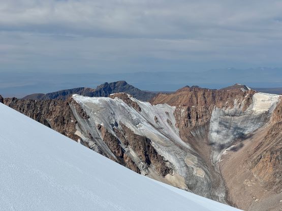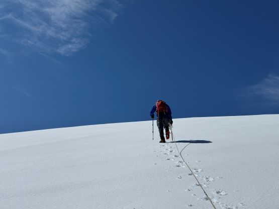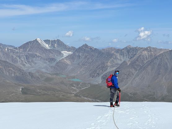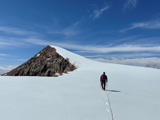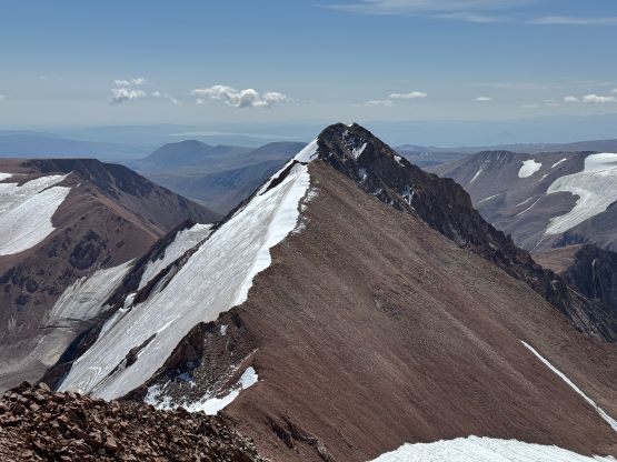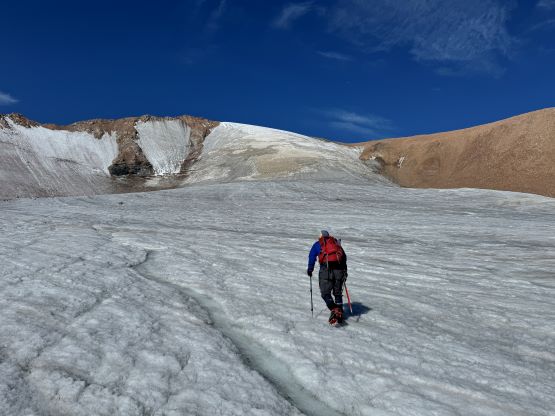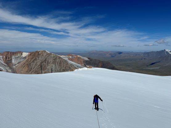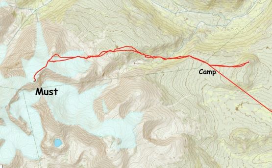 There’s still a snow cap to traverse across and that was not to be underestimated. We stayed roped up as we were on snow, not ice and discovered at least one ankle-biter on an unexpected place. Looking around we could definitely see signs of crevasses and this traverse was almost 2 km long with still substantial amount of elevation gain. The weather was cooperating, at last. Finally we arrived at the summit and got to look at the competing summit about 2 km to the SW. Without a hand level it was not possible to tell by visualization and both peaks have a 4040 m contour on my map. Thankfully Petter found another map that shows a 4060 m contour on Must Peak, and that elevation is confirmed by my Gaia GPS app, so I considered this as “good enough”. The traverse between the two peaks looks complicated and likely will take the majority of a day, and there’s no obvious “better” way in reaching that SW peak.