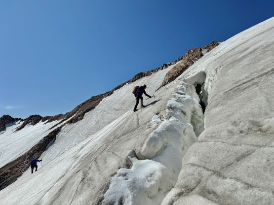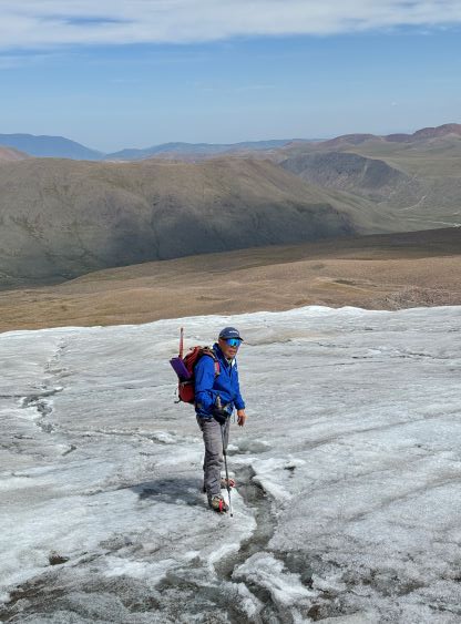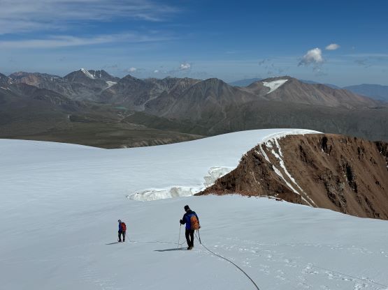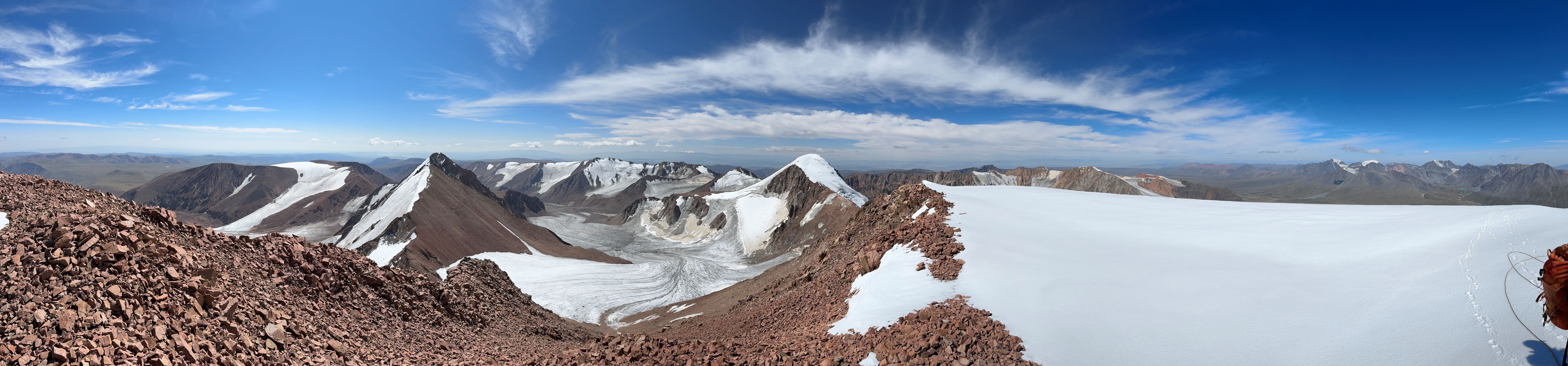 The lower glacier was low-angled ice that was easy with just crampons and two trekking poles but then Manlai somehow decided to make a full ascent of this east facing glacier. I thought the easiest way was to get off the glacier to scramble up some horribly loose choss on the far climber’s right side, but I wasn’t opposing the idea of making a more technical climb, especially considering our climb of Turgen Uul a few days later. The glacier turned out to be harder than I thought, and we were forced to rope up after hitting some unconsolidated snow bridges. Our guide is very experienced with a solo ascent of Shishapangma on his resume but when it came to glacier travel I trusted my own navigation more, so I led across probing extensively. There were at least 3 or 4 very sketchy snow bridges in addition to some low-angled ice climbing but we did succeed in finding a way through. We all agreed to take the dry route on the descent.