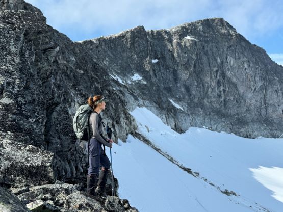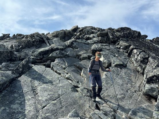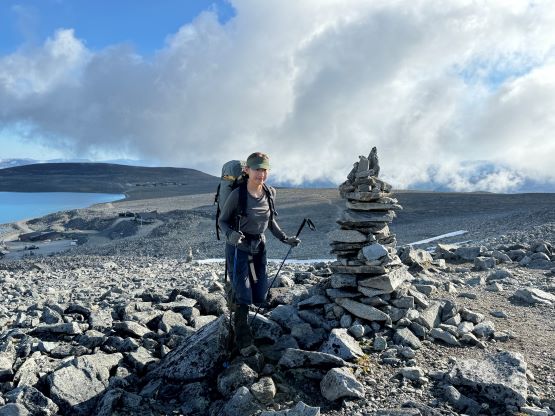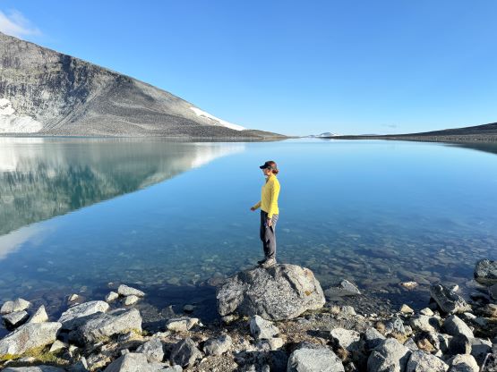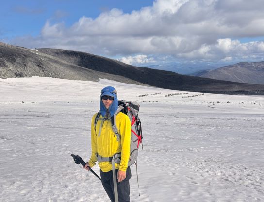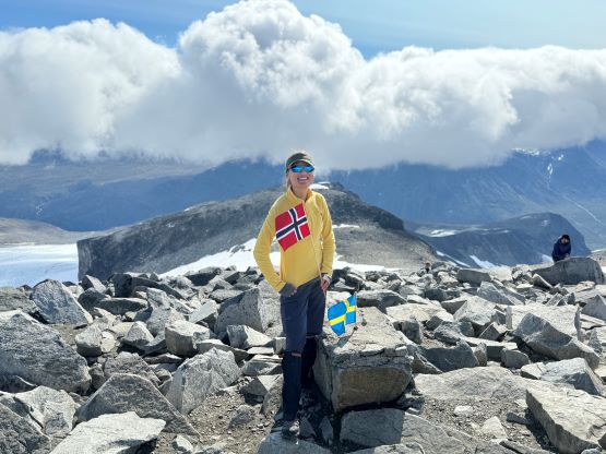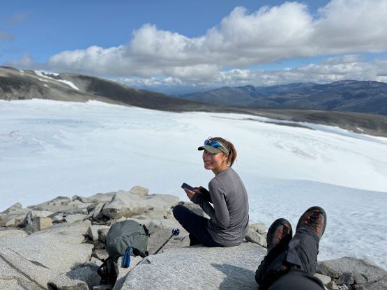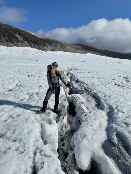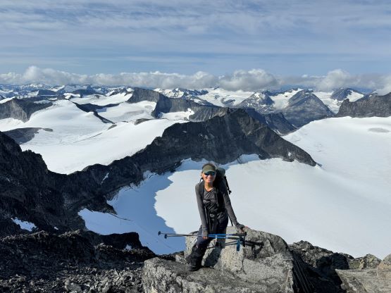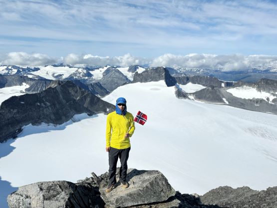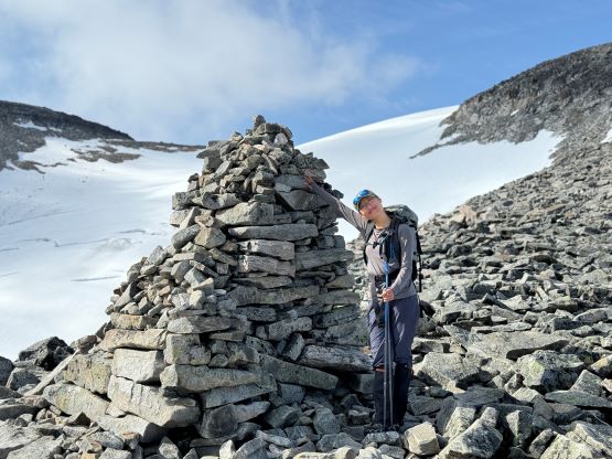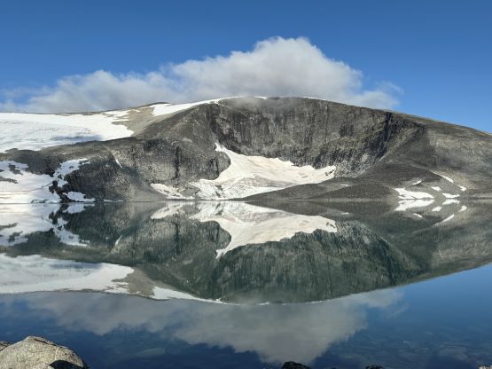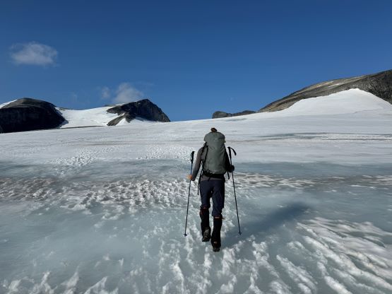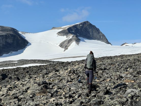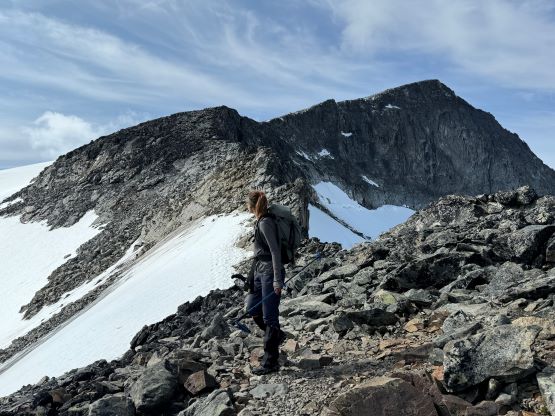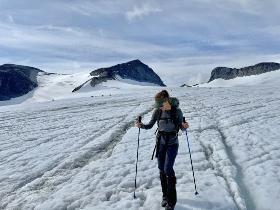 In terms of the gears we decided to not carry the rope but bring crampons and mountaineering boots. The boots were handy on the way back to help my feet stay reasonably dry on the glacial “swamps” but the crampons were entirely not necessary. In any case we did some easy boulder-hopping to get onto the main path that came from Juvesshytta and easily followed the long and gradual path to the glacier crossing. The trail was as expected, not a perfect path but with some boulder fields and snow crossings but the bearing was straightforward and the travel was generally easier than on Snøhetta. I’d heard about the crowding situations on this peak and I started to wonder if we were lucky or some, because we saw nobody ahead and none behind neither. It turned out that we just started “too early” even though I honestly didn’t think we had started that early. The glacier was drier and icier than expected, but was mostly just a plod. I started by wearing trail-runners and was expecting to change to the boots at some point but that was never needed. The route could be managed without any crevasse crossings but I directed us to a few crevasses just for Erica to experience that. That was quite fun actually and added to the variety.
