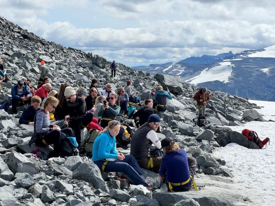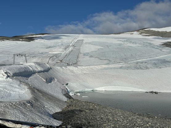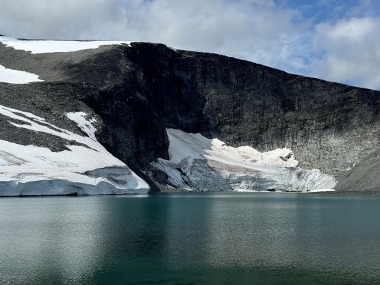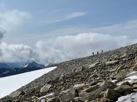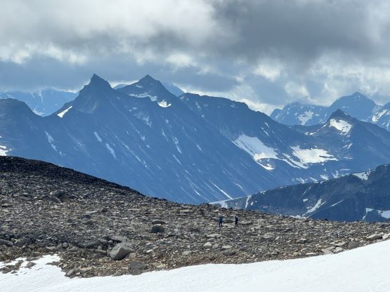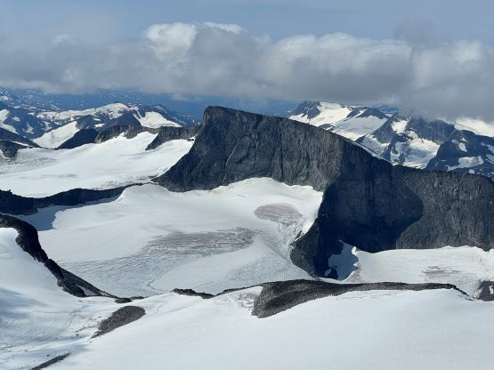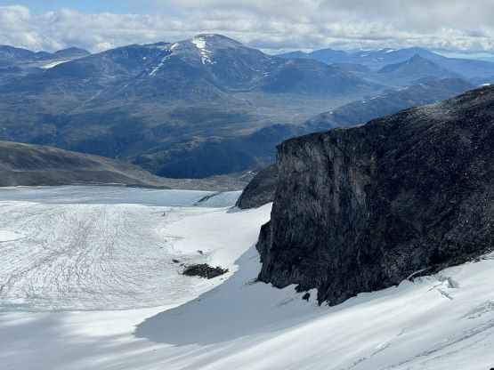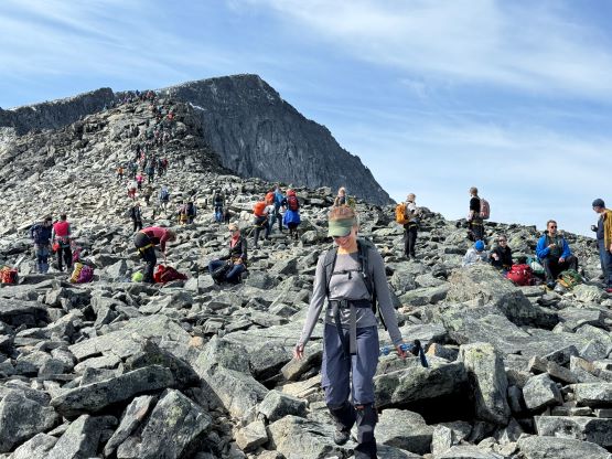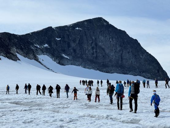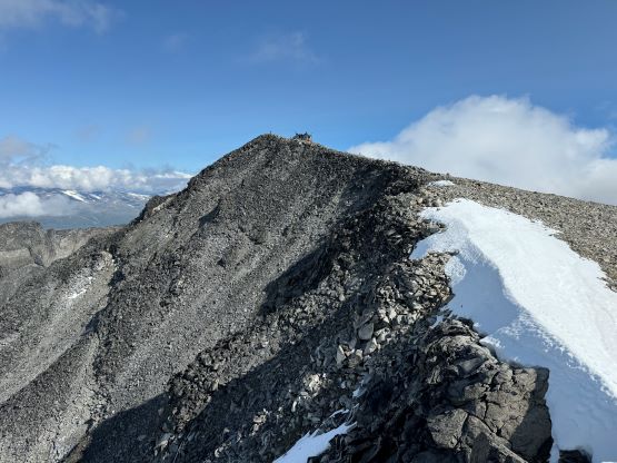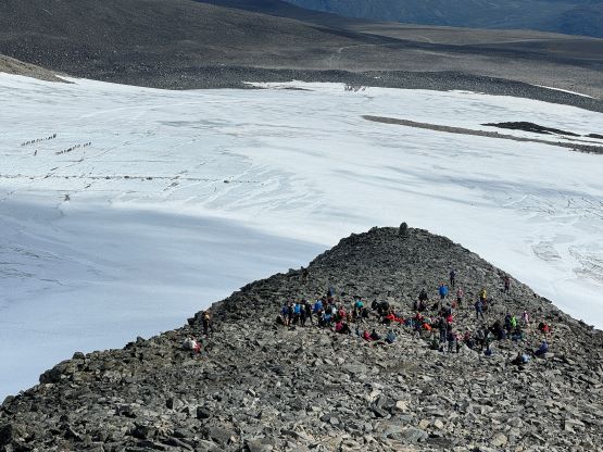 We were joined by at least 15 other hikers that came up from the longer route, but a few more groups also started to show up via the standard route. It was getting crowded up there so we quickly descended, but while descending the NE spur I noticed those gangs of people marching up the glacier, and sure enough those were the properly guided groups. They had put 30-40 people on a single rope which was quite amusing to see. I had never observed that kind of glacier travel before, but I guess the strategy would work due to the enormous mass of the team and the friction generated to reduce the acceleration if one person fell in. While plodding back across the glacier we crossed path with at least 6 teams like that, and more were gearing up at the start. The last 10 m before exiting the glacier had unfortunately already turned into a “swamp”, but the depth was below boot’s top so I was able to keep the feet dry. I had already swapped the trail-runners for the mountaineering boots as I was anticipating some sort of post-holing on the glacier, and I definitely made the right decision. The rest of the return was uneventful and we did not get a parking ticket neither. I wasn’t having a plan for the rest of the day but I had made plan to join Adam for Skåla on the next day, but while driving there we made the spontaneous decision to jack up the ambition to tackle Tron in the evening.