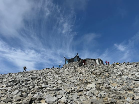 Eventually we followed the main path to get onto the NE Ridge which would offer the passage to the upper plateau. The steep and crevassed glacier on the climber’s left would offer a more enjoyable way but we weren’t properly equipped for that, so stuck with the standard route. There was actually some scrambling involved on this spur/ridge but the terrain was mostly easy boulder-hopping, and there were enough cairns and paths to lead the way. After about 300 m elevation gain we arrived at the plateau and joined the hikers that came up from the longer and more eastern route. There was a hut on the summit and the infrastructure reminded me a little bit of Fuji in Japan, but not to that extreme level. We also explored the ridge extending southwards for more photos. I was honestly quite excited about the glaciers in the immediate vicinity as the landscape wasn’t something we were used to in our home region.