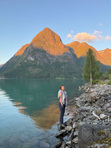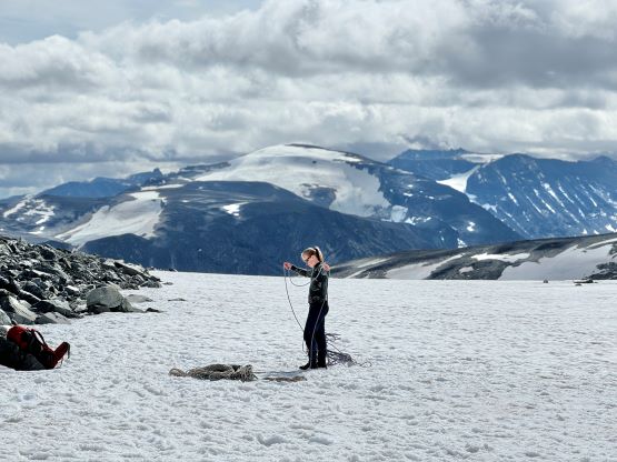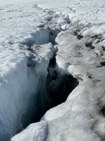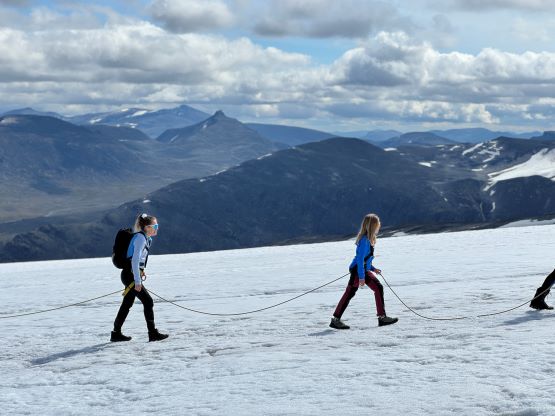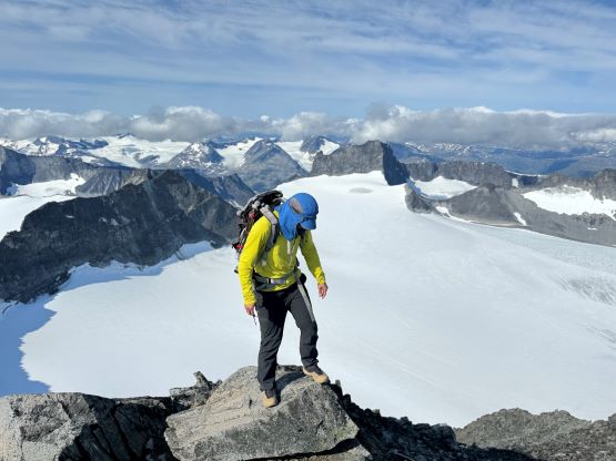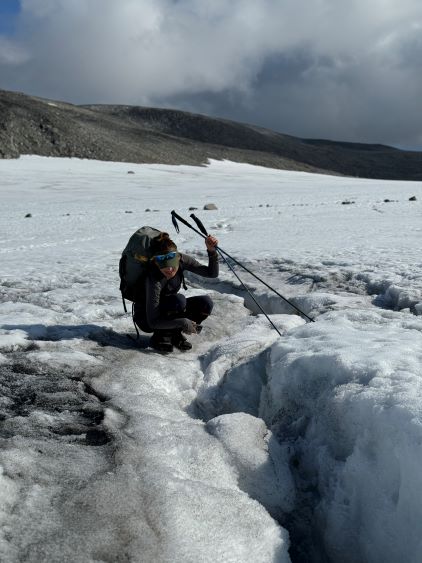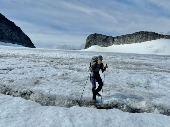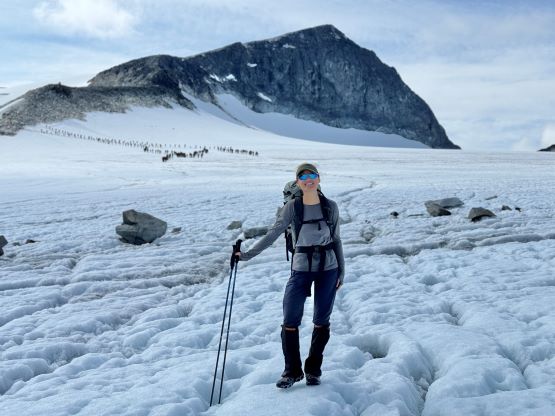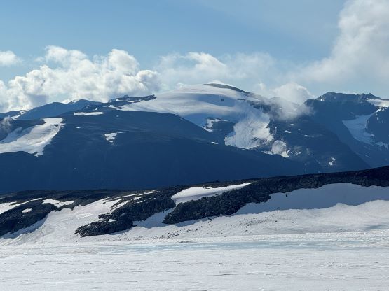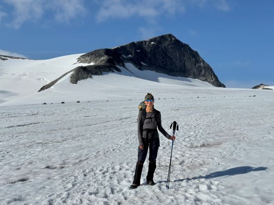 In terms of the gears we decided to not carry the rope but bring crampons and mountaineering boots. The boots were handy on the way back to help my feet stay reasonably dry on the glacial “swamps” but the crampons were entirely not necessary. In any case we did some easy boulder-hopping to get onto the main path that came from Juvesshytta and easily followed the long and gradual path to the glacier crossing. The trail was as expected, not a perfect path but with some boulder fields and snow crossings but the bearing was straightforward and the travel was generally easier than on Snøhetta. I’d heard about the crowding situations on this peak and I started to wonder if we were lucky or some, because we saw nobody ahead and none behind neither. It turned out that we just started “too early” even though I honestly didn’t think we had started that early. The glacier was drier and icier than expected, but was mostly just a plod. I started by wearing trail-runners and was expecting to change to the boots at some point but that was never needed. The route could be managed without any crevasse crossings but I directed us to a few crevasses just for Erica to experience that. That was quite fun actually and added to the variety.