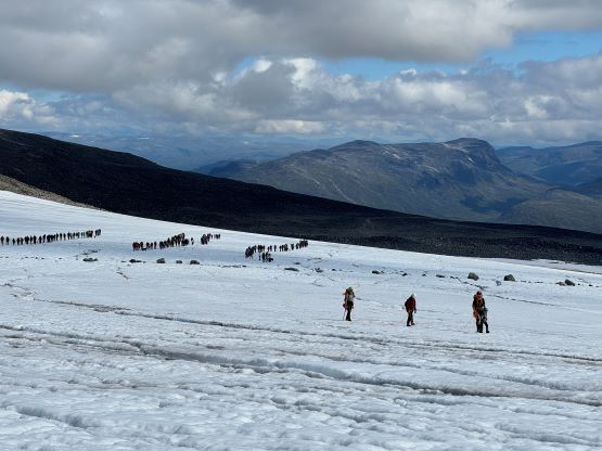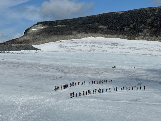 We were joined by at least 15 other hikers that came up from the longer route, but a few more groups also started to show up via the standard route. It was getting crowded up there so we quickly descended, but while descending the NE spur I noticed those gangs of people marching up the glacier, and sure enough those were the properly guided groups. They had put 30-40 people on a single rope which was quite amusing to see. I had never observed that kind of glacier travel before, but I guess the strategy would work due to the enormous mass of the team and the friction generated to reduce the acceleration if one person fell in. While plodding back across the glacier we crossed path with at least 6 teams like that, and more were gearing up at the start. The last 10 m before exiting the glacier had unfortunately already turned into a “swamp”, but the depth was below boot’s top so I was able to keep the feet dry. I had already swapped the trail-runners for the mountaineering boots as I was anticipating some sort of post-holing on the glacier, and I definitely made the right decision. The rest of the return was uneventful and we did not get a parking ticket neither. I wasn’t having a plan for the rest of the day but I had made plan to join Adam for Skåla on the next day, but while driving there we made the spontaneous decision to jack up the ambition to tackle Tron in the evening.