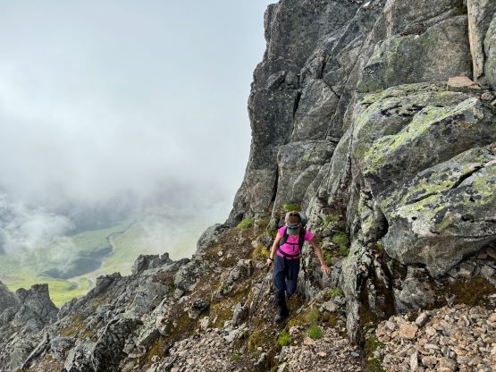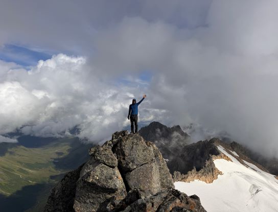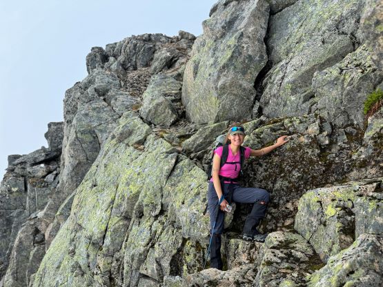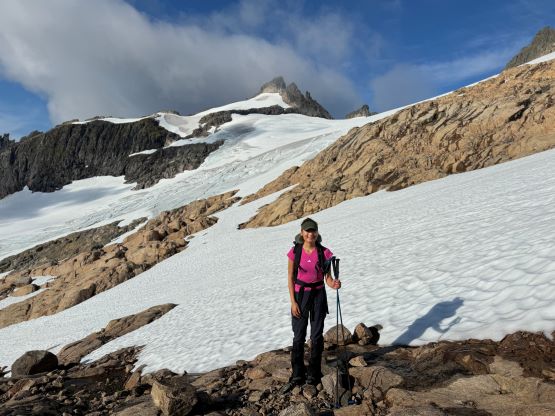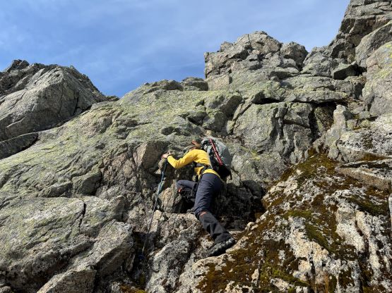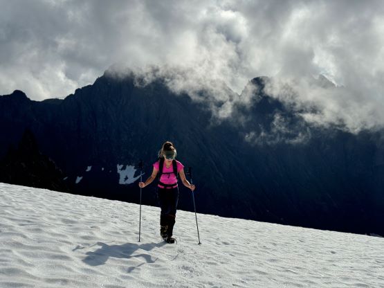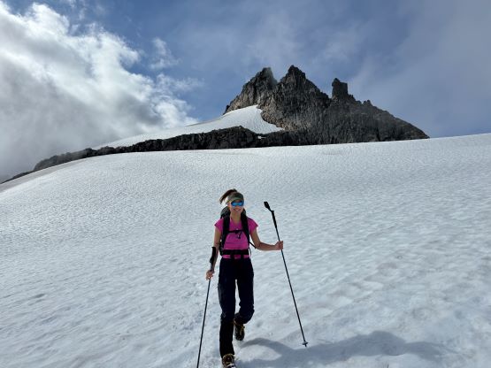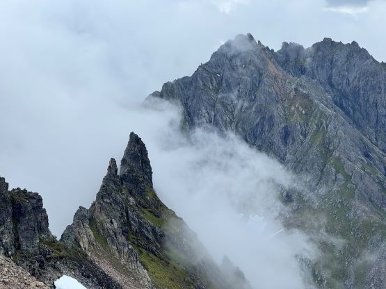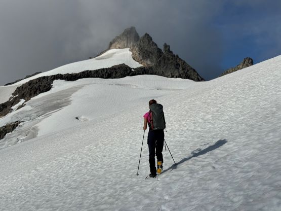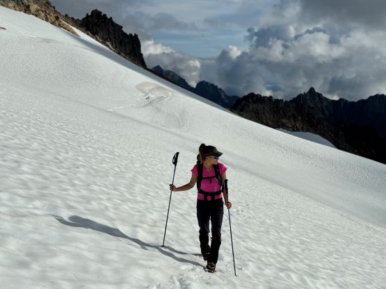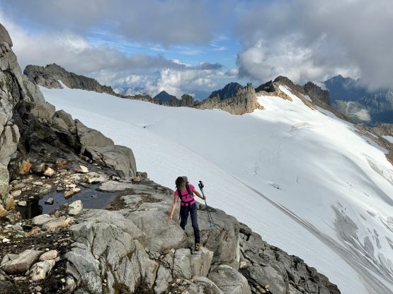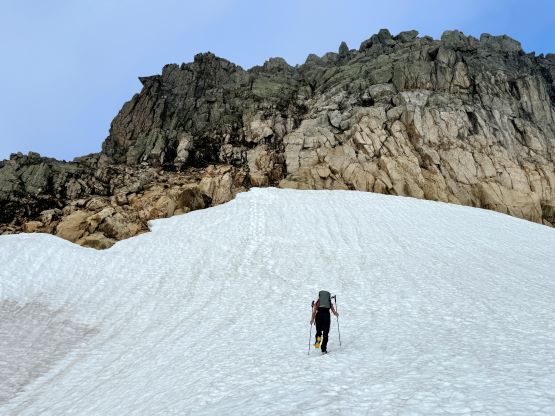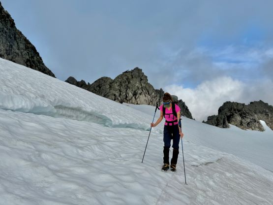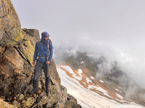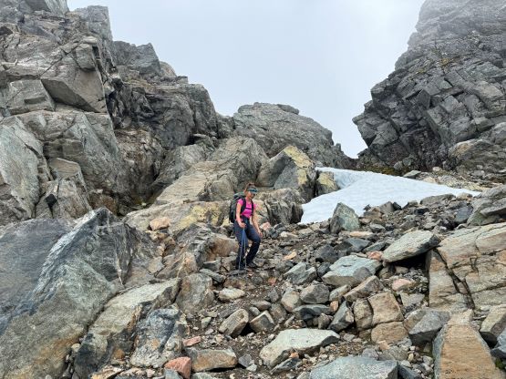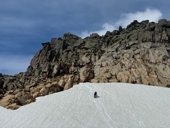 Once on the other (south) side of the notch we descended a little bit and then kept a rising traverse over slabs, snow and some difficult micro-terrain to access the glacier. In retrospect it would be easier to lose a little bit more elevation to stay mostly, if not entirely on low angled snow slopes but it worked out both ways. I also decided to not follow the existing GPX track to cross the glacier, but rather take a more direct route. There were two notable crevasses to cross on snow bridges and it would be nicer to show Erica some actual glacier navigation up there. The second crevasse which was way up high near the upper rock face required some careful probing. We then had some easy 3rd class scrambling to deal with (with crampons on), and then there came the highest snow face below the summit block. This slope eventually steepened to around 40 degrees but the snow was reasonably soft and there was no need to use an ice axe. The summit block was easier than appeared with quite a few hidden ledges to guide the way, but there’s a sting in the tail. Most parties claimed this peak by reaching the summit ridge but the highest point lies on the far north side. The traverse across required some sustained difficult scrambling with decent amount of exposure. At least one spot was 4th class and the rocks were covered in moss and very slippery. We actually did the full traverse two times as the weather improved as we got back to the false summit. I decided instantly to go back to the true summit for more photos and Erica followed. Meanwhile there was a team of three coming up but they only went to as far as the summit ridge, and we exchanged our respective surprises of seeing another human being up on this objective.