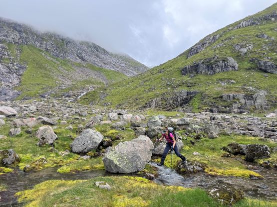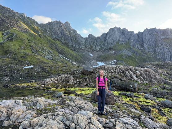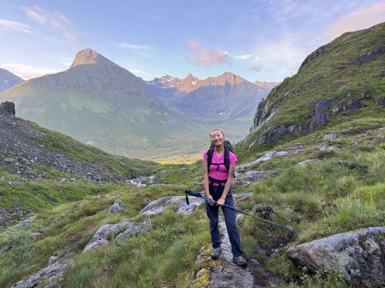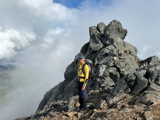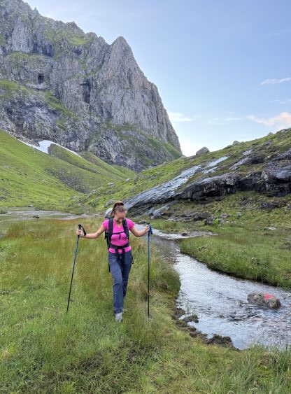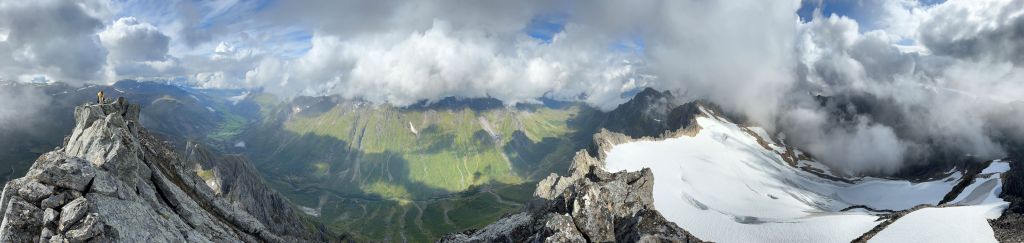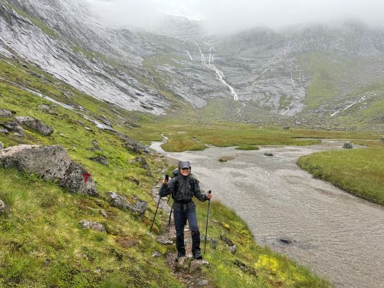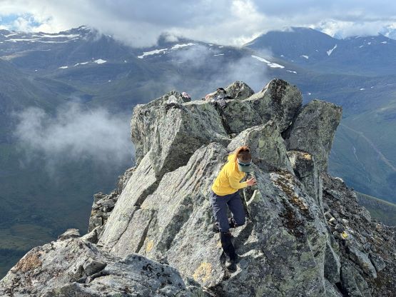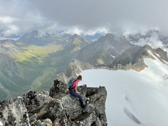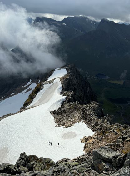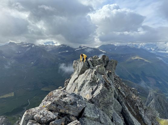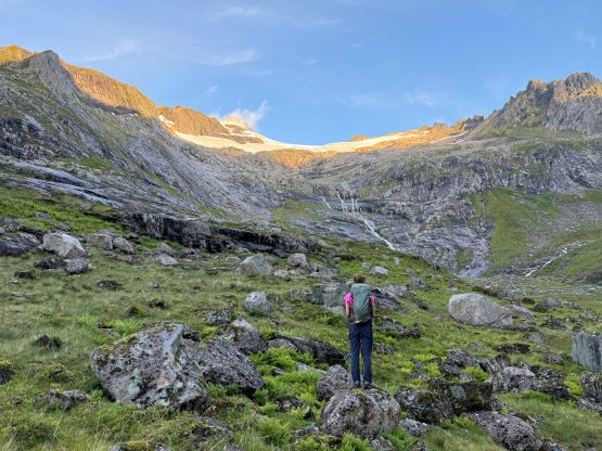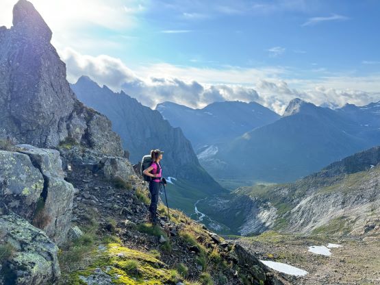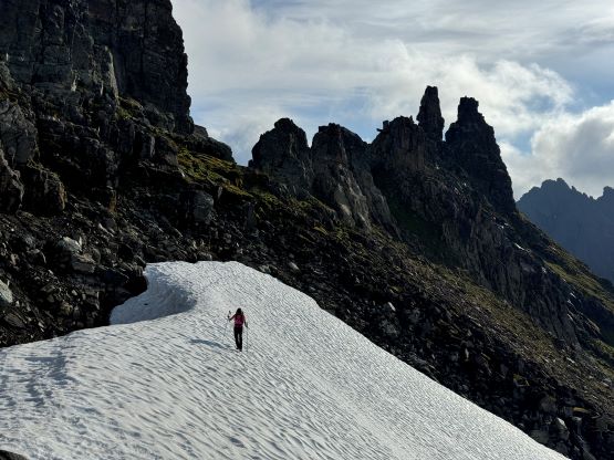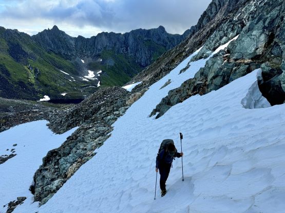 Kolåstinden is the highest peak in the large area to the NE of Orsta and subsequently boasts over 1000 m prominence. This is also an iconic looking summit that doesn’t quite offer an “easy” route to the top. It seems like most parties had climbed this peak on skis in the spring but it is also very doable in summer, with some simple glacier travel and exposed scrambling near the summit. There’s a well-used trail that ascends into the valley between Kolåstinden and Saetretinden and that can be used as the access trail in summer. I had downloaded a GPX track from Peakbook but that involves a full traverse of Kolåstinden and the north and south summits of Sætretinden, which wasn’t super helpful but I had figured out the most efficient way based on the topographic maps. This was one of the primary objectives between Erica and I because it involved everything.