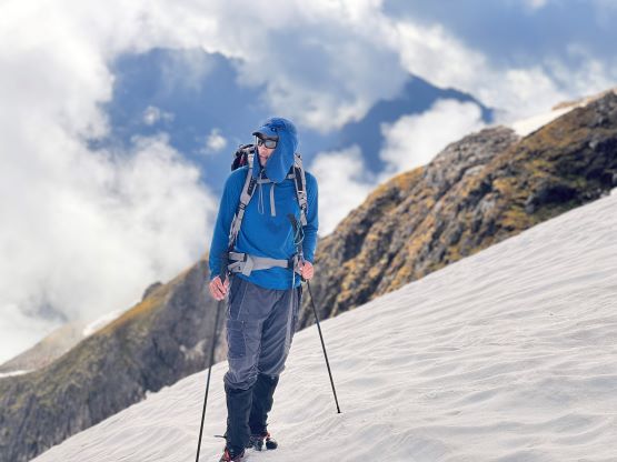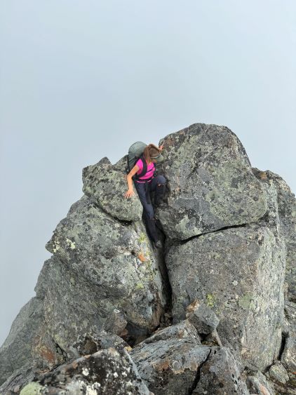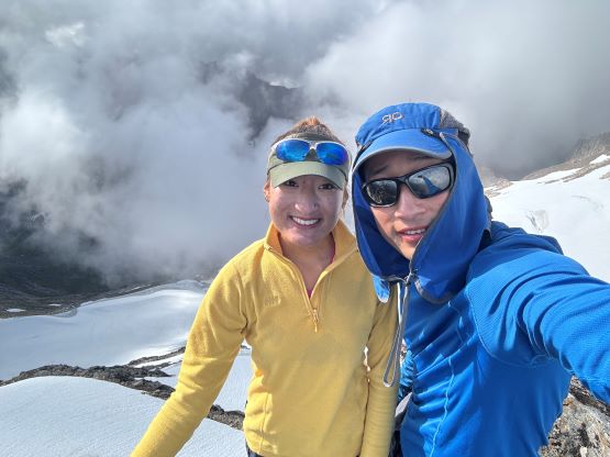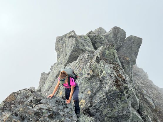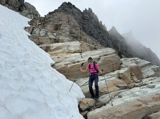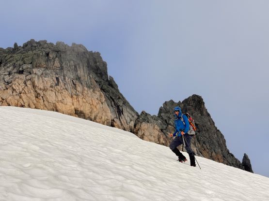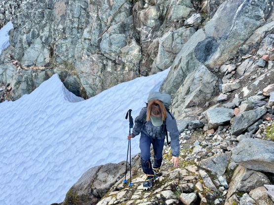 Once on the other (south) side of the notch we descended a little bit and then kept a rising traverse over slabs, snow and some difficult micro-terrain to access the glacier. In retrospect it would be easier to lose a little bit more elevation to stay mostly, if not entirely on low angled snow slopes but it worked out both ways. I also decided to not follow the existing GPX track to cross the glacier, but rather take a more direct route. There were two notable crevasses to cross on snow bridges and it would be nicer to show Erica some actual glacier navigation up there. The second crevasse which was way up high near the upper rock face required some careful probing. We then had some easy 3rd class scrambling to deal with (with crampons on), and then there came the highest snow face below the summit block. This slope eventually steepened to around 40 degrees but the snow was reasonably soft and there was no need to use an ice axe. The summit block was easier than appeared with quite a few hidden ledges to guide the way, but there’s a sting in the tail. Most parties claimed this peak by reaching the summit ridge but the highest point lies on the far north side. The traverse across required some sustained difficult scrambling with decent amount of exposure. At least one spot was 4th class and the rocks were covered in moss and very slippery. We actually did the full traverse two times as the weather improved as we got back to the false summit. I decided instantly to go back to the true summit for more photos and Erica followed. Meanwhile there was a team of three coming up but they only went to as far as the summit ridge, and we exchanged our respective surprises of seeing another human being up on this objective.