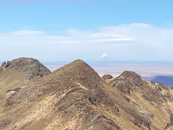 From the point I was dropped off I had to plod a long ways due south with substantial amount of elevation gain just to get to the road’s end and this started to shape up to be a longer hike than anticipated. I made quick work to the road’s end at around 4350 m elevation and ascended onto the ridge ahead. At this point I was not aware there’s actually a trail from here all the way to the summit, as the trail was not shown on my Gaia map. After descending briefly into the other side I picked up the trail. The original plan was to scramble over a series of towers on the ridge but with this trail I would just traverse underneath them. That saved a lot of time and before realizing I was already at the base of the north ridge. I had to take a break somewhere along this final 300 m grunt but overall it was an easy plod to the very summit. There was another peak much farther to the south that looked to be just as tall. The contour lines on the maps could not even tell which is actually higher, but it was too far away to investigate.