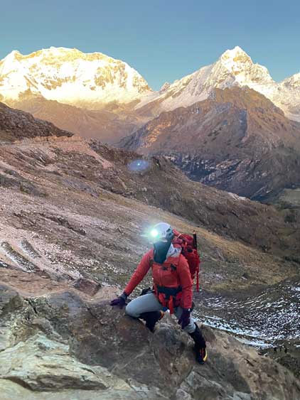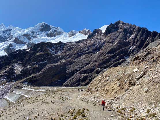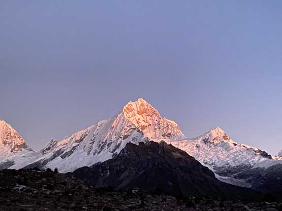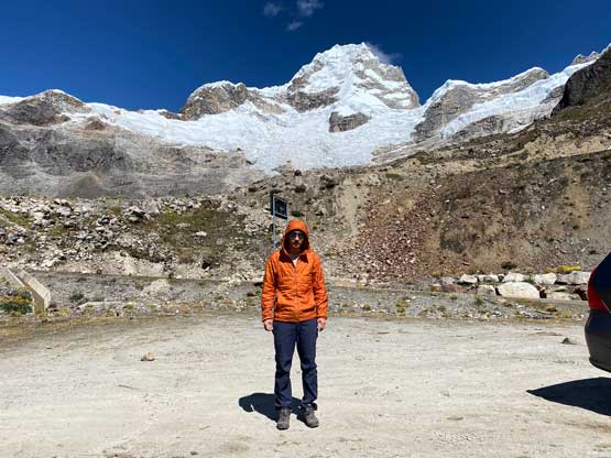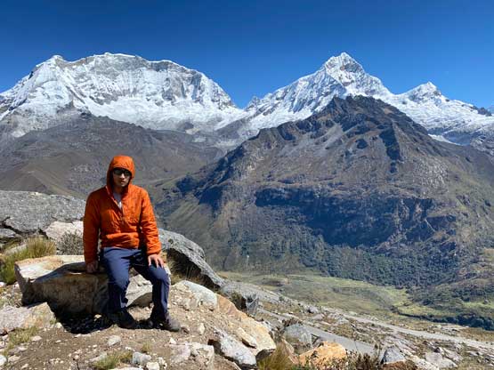 Lily with Chopicalqui behind. Far in the distance is Chacraraju