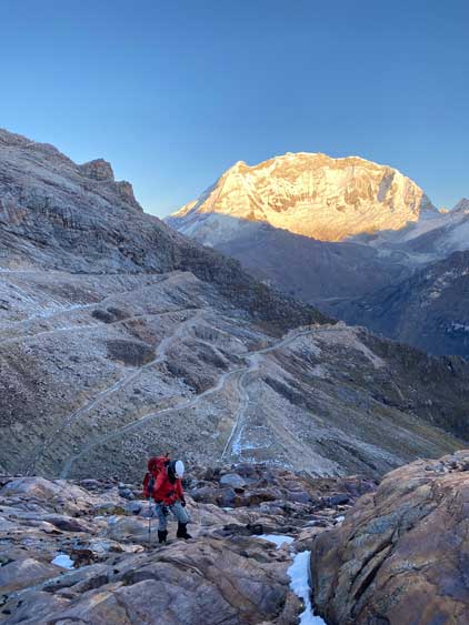 After hiking Laguna Wilcacocha and then Laguna Churup Lily and I still needed one more acclimatization hike/climb before tackling the main objectives in this trip, namely Yanapaccha and Alpamayo. I had extended the Laguna Churup’s hike to the summit of the nearby Co. Cachijirca at almost 5000 m altitude but Lily hadn’t broken 4500 m yet. I thought a day-ascent of Nev. Mateo would make the most sense at the moment. After talking to Sergio our guiding company’s director a plan was formed. To ascend this peak we did not need a guide nor a porter but we needed him to organize the transportation logistics. David who drove us to the previous two hikes was still available for the day and the plan was to get up at 2:30 am and start driving by 3:30 am. The drive was a long one past Carhuaz and eventually we made to the trail-head at 4700 m about an hour before sunrise. The last portion of this road was endless switchbacks but at least the road’s mostly all paved. I slept on the back seat for most of the time.