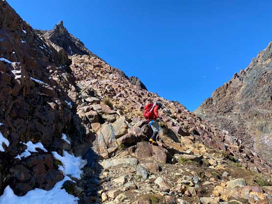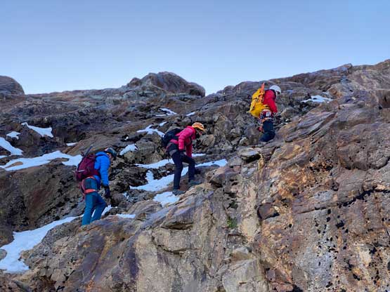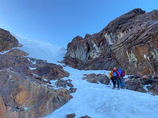 Gearing up in the dark and coldness was not easy especially considering I was feeling quite sick since the the airplane landed in Mexico City a few days ago. I even felt like I might be having a fever at the moment but I was still able to walk so we had to continue. We firstly walked down the deactivated portion of the road and then picked up a climber’s trail ascending steeply towards a wall. Ascending this rock wall was exposed 3rd class on down-sloping terrain. With our high altitude mountaineering boots and the heavy backpacks we decided to rappel later on the return. We then traversed another exposed 3rd class ledge with snow and ice on it. There were existing bolts for running belay but we didn’t feel the need to do such. We were already moving at a snail’s pace thank to the altitude and my illness so we didn’t want to fuss around with fancier operations. The sun’s slowly rising behind the horizon at this point and the views made the suffering worthwhile. We then ascended a long section of confusing terrain before taking a much-needed break at the edge of the glacier. I thought about to turn around but decided against it.