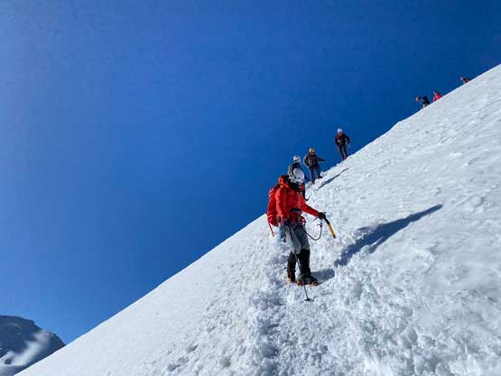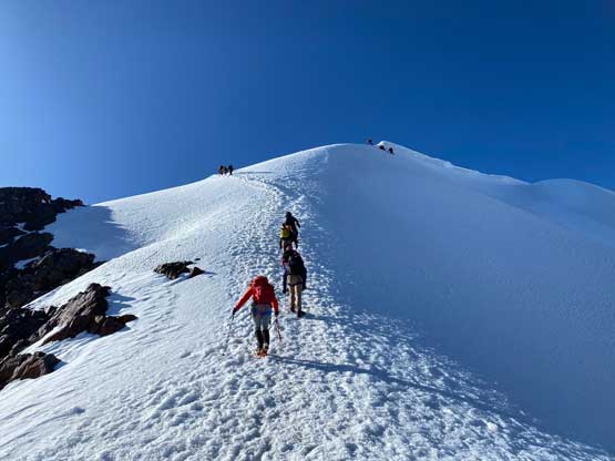 The glacier was rather a permanent snow field so with a very defined path we didn’t feel the need to rope up. We actually ditched the rope at the edge of the glacier to lighten up the packs. The climb was steeper than appeared with sections of 40+ degrees snow but again, there’s a trench of tracks to follow so the going was straightforward. I was really struggling on the final 100 m gain to the summit. Lily went ahead but I was never able to catch up until the very summit. I barely had the energy to take some pictures and eat some food so despite the good views the day had been extremely miserable for me. But I made the summit and that’s all what mattered.