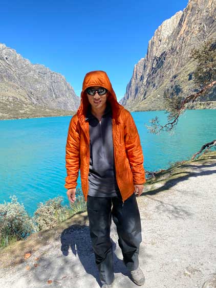 In addition to the guide we also hired one cook who’s also going to be the porter, as well as the round trip transportation. This peak requires a long and difficult drive on rough roads so the transportation was not nothing. Together we would pay 460 US dollars each for the 2-day climb. Comparing to Alpamayo this cost was rather minimal so none of us hesitated much. The approach day would be rather short with only a couple kilometers distance and a few hundred meters’ elevation gain. The drive from Huaraz to the trail-head would be rather long though so we still had to get up fairly early. I think we eventually left the hotel at 8 am. Just like on Co. Cachijirca and Nev. Mateo our driver was still David but this time we also had William and Juanito (cook/porter) accompanying. The first highlight of this trip was the drive up through Llanganuco valley. We passed two lakes – Chinan Cocha which stands for female and then Orkoncocha which stands for male. We stopped at both lakes for photos. The access past Nevado Pisco/Laguna 69’s turn-off had drastically downgraded to a narrow Jeep road. Thankfully our driver had his element and about 2 hours later we arrived at the proper trail-head at 4600 m not needing to walk any extra distance. David would drive back to Huaraz in the afternoon and drive back up here the following day, while Juanito spent the next half an hour preparing the snacks for the group. With only 1 porter Lily and I had to carry ~35 lb packs whereas William’s pack easily weighed over 80 lb.