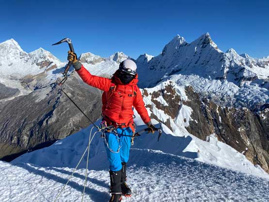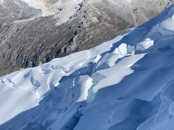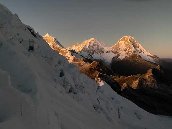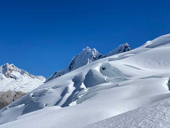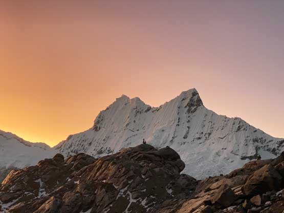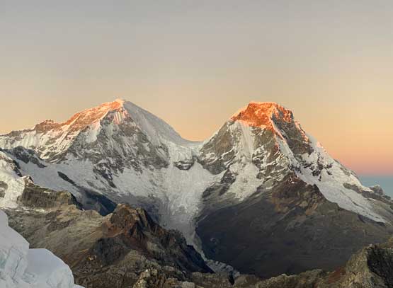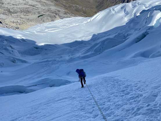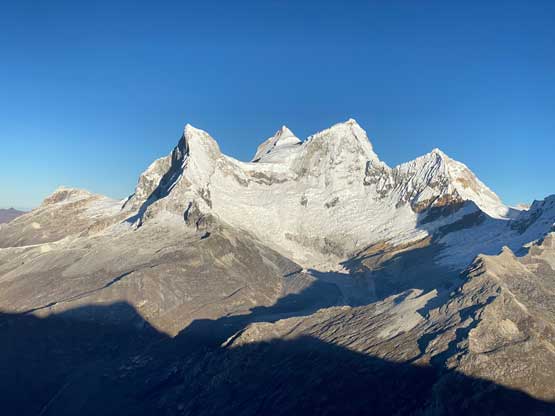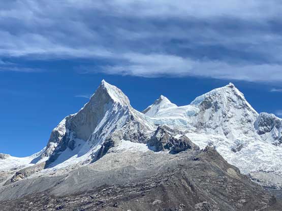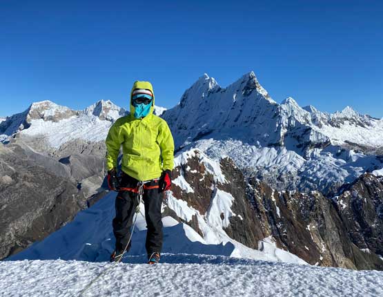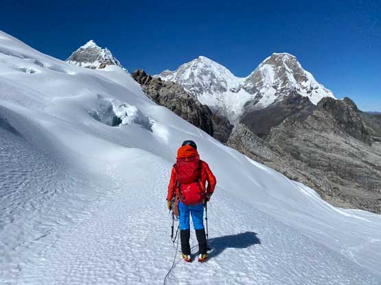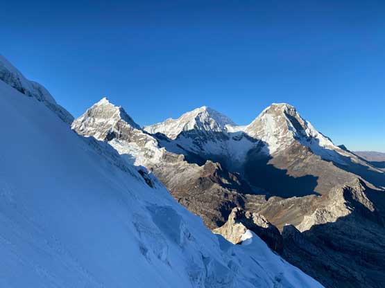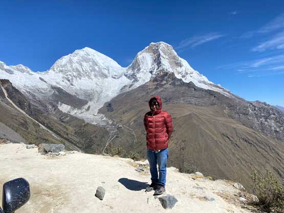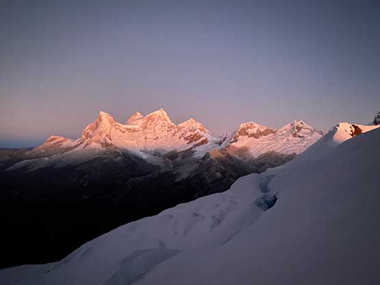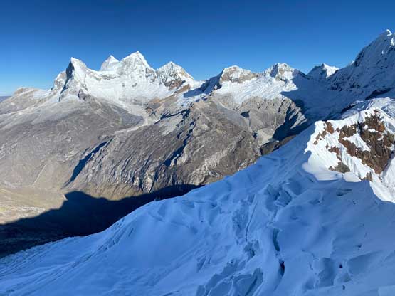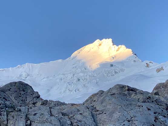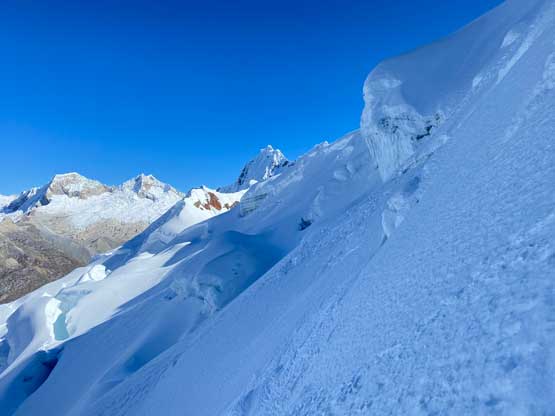 Nev. Yanapaccha locates in the heart of Cordillera Blanca surrounded by numerous giants. At elevation of 5460 m this peak is far from “short” but in this part of the world this is not considered as a tall peak. However, this peak has its unique attraction. Firstly is the incredible views (one of the best in Cordillera Blanca) and secondly is the short but fun technical challenges. This is not a walk-up summit but also not as daunting as giants like Alpamayo. The climb requires two or three pitches of 55+ degrees snow and ice such that this serves as a perfect training ground and acclimatization climb for Alpamayo. The original plan for Lily and myself was to climb Vallunaraju to acclimatize but we changed the plan at the last minute. Due to my sickness (not altitude related) I lacked the energy to carry weight and we thought hiring guides/porters for a walk-up summit was rather wasteful. If we must hire a guide then we preferred an actual climb. Thankfully Sergio from Nuestras Montañas was able to adjust to our last-minute request as the year 2022 was not particularly busy. Our guide William happened to have the next few days available anyway so he would guide us both on Yanapaccha and then Alpamayo, which seemed like the ideal plan.