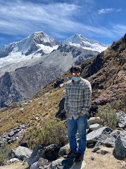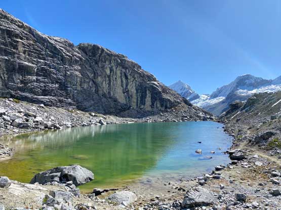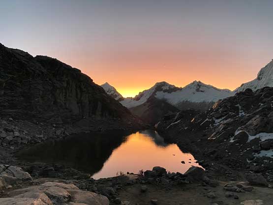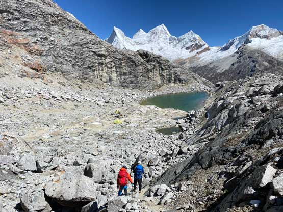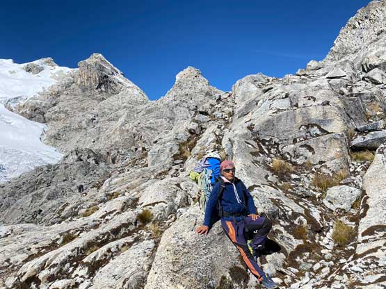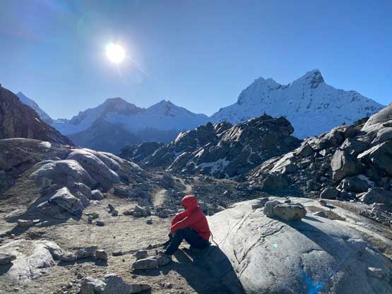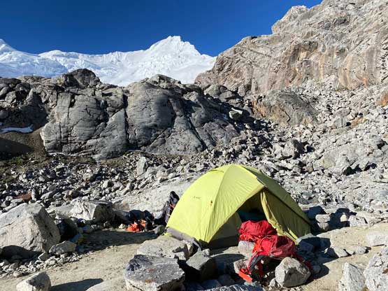 Right off the bat I was struggling with the weight as I was definitely feeling lack of energy due to the sickness but I tried really hard to keep up the pace nonetheless. Thankfully William had the experience to lead at a slow pace so I never had to call him to slow down or to call for a break. Lily and I had some talks about our pack’s weight and the decision was to hire an additional porter for Alpamayo to increase our chance of success. The view from this approach was incredible with Huascarán, Chopicalqui, Huandoy, Chacaraju etc. looming around. It’s worth noting that this approach had fair amount of undulating terrain with probably over 50 m of elevation loss in total, which would surely suck a day later on the return. The final ascent to the campsite at 4700 m was also quite steep and consumed a lot of energy out of us. We reached the camp in about 2 hours and we had a few more hours to kill. William and Juanito would then set up the tents and cook hot water and dinner so Lily and I didn’t really need to do anything, but resting.