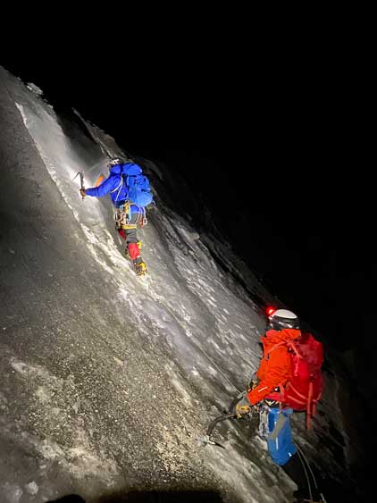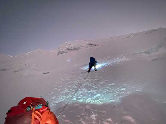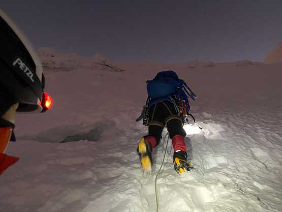 We woke up at 1:30 am after basically zero sleep and soon off we went. Lily and I followed William’s lead over more undulating moraine on game trails to the edge of the glacier. To get onto the glacier proper required one short pitch of hard ice right off the bat. I was a bit too excited to test my ice climbing skills so I swung the tools a bit too hard. The ice was rather shitty that they broke upon a hard swing, but whatever. We all got up the pitch without needing to be properly belayed. It was then a long and tiring slog on increasingly steep snow following existing tracks. In the pitch dark we couldn’t really see anything so the job was to simply follow the person in front and not thinking about too much. The slope angle increased to 45+ degrees eventually and we all took out the second ice tool, but the pitched climbing didn’t really start until just below the bergschrund. William led three pitches of 55+ degrees snow or snice and Lily and I followed up with ease. The crux was actually to break the cornice to hop onto the summit ridge, which required a few ninja moves. Lily climbed up through using some ice climbing techniques that looked beautiful and aesthetic, whereas I awfully used my knees and belles…
