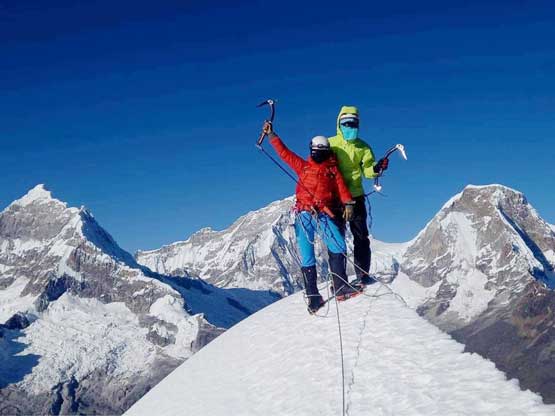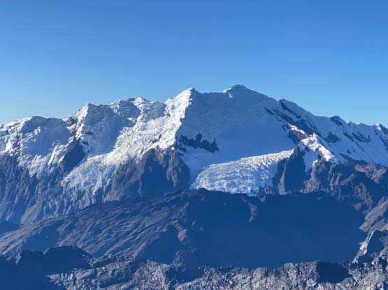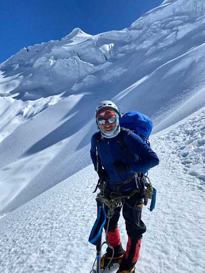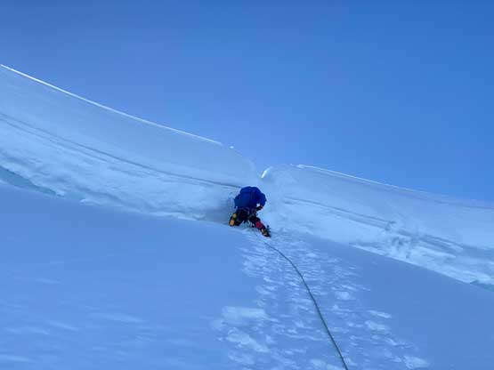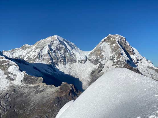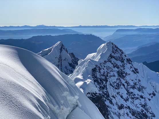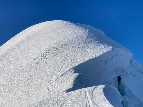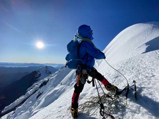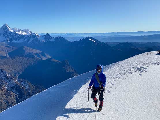 Once topping out onto the summit ridge the technical difficulties were all behind, but the ridge traverse to the summit wasn’t trivial. We still had to be extremely careful as the ridge was still steep (over 35 degrees) and exposed. William led in front short-roping the two of us onto the summit plateau. I then noticed a knife edge that appeared taller, so William then belayed us to check out the true summit. The views were as incredible as expected and we lingered for a while to fully soak in the experience.