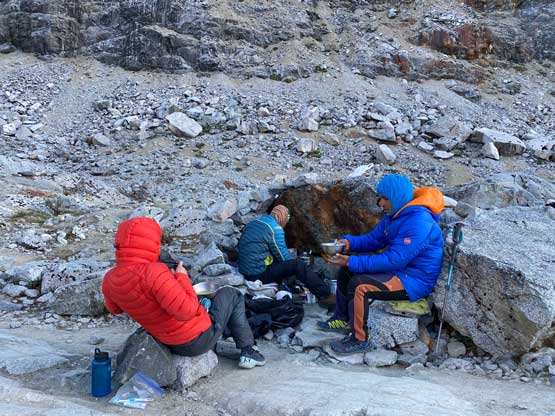 In addition to the guide we also hired one cook who’s also going to be the porter, as well as the round trip transportation. This peak requires a long and difficult drive on rough roads so the transportation was not nothing. Together we would pay 460 US dollars each for the 2-day climb. Comparing to Alpamayo this cost was rather minimal so none of us hesitated much. The approach day would be rather short with only a couple kilometers distance and a few hundred meters’ elevation gain. The drive from Huaraz to the trail-head would be rather long though so we still had to get up fairly early. I think we eventually left the hotel at 8 am. Just like on Co. Cachijirca and Nev. Mateo our driver was still David but this time we also had William and Juanito (cook/porter) accompanying. The first highlight of this trip was the drive up through Llanganuco valley. We passed two lakes – Chinan Cocha which stands for female and then Orkoncocha which stands for male. We stopped at both lakes for photos. The access past Nevado Pisco/Laguna 69’s turn-off had drastically downgraded to a narrow Jeep road. Thankfully our driver had his element and about 2 hours later we arrived at the proper trail-head at 4600 m not needing to walk any extra distance. David would drive back to Huaraz in the afternoon and drive back up here the following day, while Juanito spent the next half an hour preparing the snacks for the group. With only 1 porter Lily and I had to carry ~35 lb packs whereas William’s pack easily weighed over 80 lb.