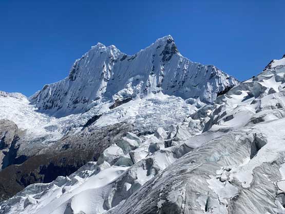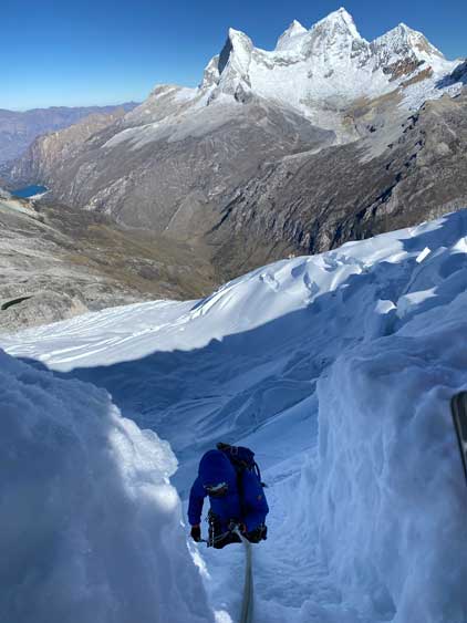 Nev. Yanapaccha locates in the heart of Cordillera Blanca surrounded by numerous giants. At elevation of 5460 m this peak is far from “short” but in this part of the world this is not considered as a tall peak. However, this peak has its unique attraction. Firstly is the incredible views (one of the best in Cordillera Blanca) and secondly is the short but fun technical challenges. This is not a walk-up summit but also not as daunting as giants like Alpamayo. The climb requires two or three pitches of 55+ degrees snow and ice such that this serves as a perfect training ground and acclimatization climb for Alpamayo. The original plan for Lily and myself was to climb Vallunaraju to acclimatize but we changed the plan at the last minute. Due to my sickness (not altitude related) I lacked the energy to carry weight and we thought hiring guides/porters for a walk-up summit was rather wasteful. If we must hire a guide then we preferred an actual climb. Thankfully Sergio from Nuestras Montañas was able to adjust to our last-minute request as the year 2022 was not particularly busy. Our guide William happened to have the next few days available anyway so he would guide us both on Yanapaccha and then Alpamayo, which seemed like the ideal plan.