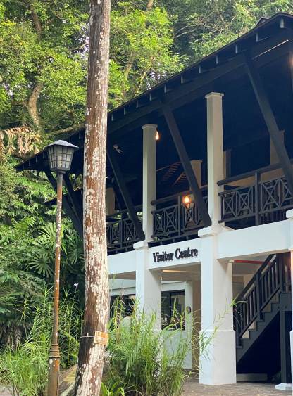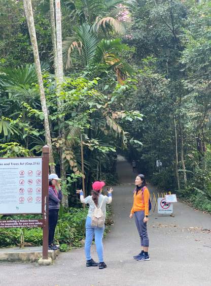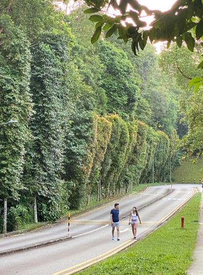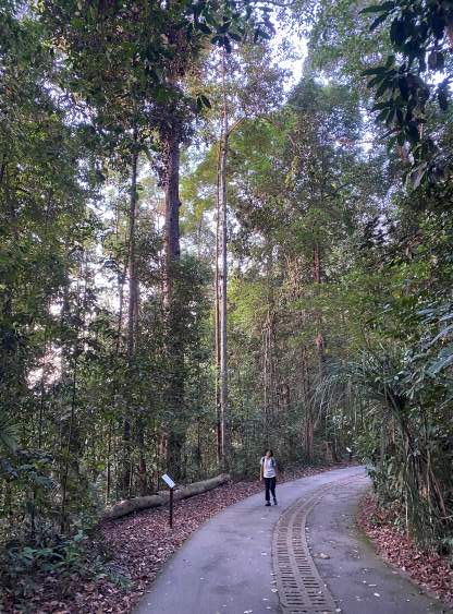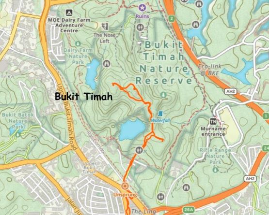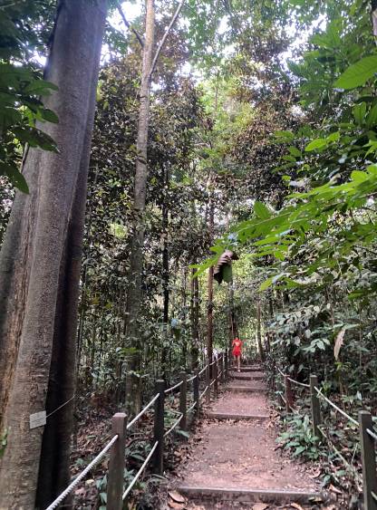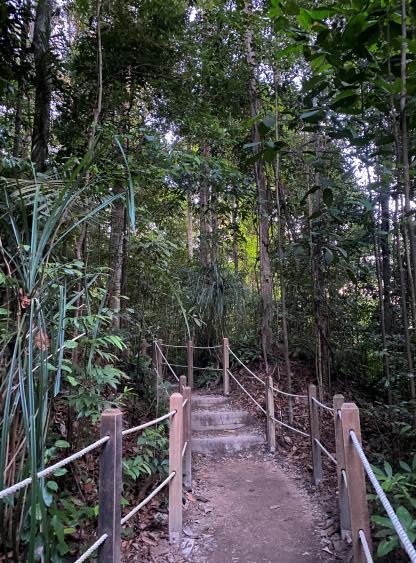 I did not give myself a ton of time to do the hike as it’s rather no-brainer. Doing backwards mathematics I decided to wake up at 5:30 am to catch the first East-West MRT (~5:50 am) from Kallang station. This worked out as planned and I transferred to Downtown line and rode to Beauty World station. The Google’s time estimate was slightly overkill, such that I arrived still in pitch dark. The Bukit Timah Natural Reserve was not supposed to open until 7 am, but I had read elsewhere (particularly in Eric Gilbertson’s trip report) that the locals go up early anyway. The walk to the trail-head was longer than I thought as I needed to detour to an overpass to cross the freeway. I got there at 6:30 am and opted to start the ascent nonetheless. It was still dark, but I was able to walk on the paved trail without the need to use head-lamps. The ascent was straightforward and took hardly any effort, but the weather was extremely hot, humid and unpleasant. For the upper route I decided to tackle the steeper east ridge on staircases, and descend the pavement that wrapped around to the west side. I also made the detour to check out the west peak and the true summit required a brief bushwhack in the jungles. It’s most likely that the east (official) summit is indeed higher, but my GPS read the west summit to be slightly higher, so peak-baggers who prefer certainty have to do both to be absolutely sure.