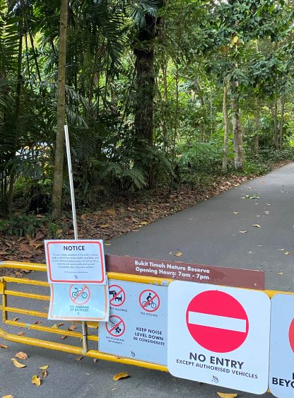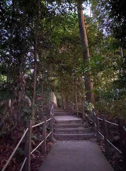 I did not give myself a ton of time to do the hike as it’s rather no-brainer. Doing backwards mathematics I decided to wake up at 5:30 am to catch the first East-West MRT (~5:50 am) from Kallang station. This worked out as planned and I transferred to Downtown line and rode to Beauty World station. The Google’s time estimate was slightly overkill, such that I arrived still in pitch dark. The Bukit Timah Natural Reserve was not supposed to open until 7 am, but I had read elsewhere (particularly in Eric Gilbertson’s trip report) that the locals go up early anyway. The walk to the trail-head was longer than I thought as I needed to detour to an overpass to cross the freeway. I got there at 6:30 am and opted to start the ascent nonetheless. It was still dark, but I was able to walk on the paved trail without the need to use head-lamps. The ascent was straightforward and took hardly any effort, but the weather was extremely hot, humid and unpleasant. For the upper route I decided to tackle the steeper east ridge on staircases, and descend the pavement that wrapped around to the west side. I also made the detour to check out the west peak and the true summit required a brief bushwhack in the jungles. It’s most likely that the east (official) summit is indeed higher, but my GPS read the west summit to be slightly higher, so peak-baggers who prefer certainty have to do both to be absolutely sure.
