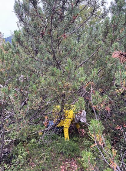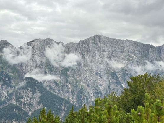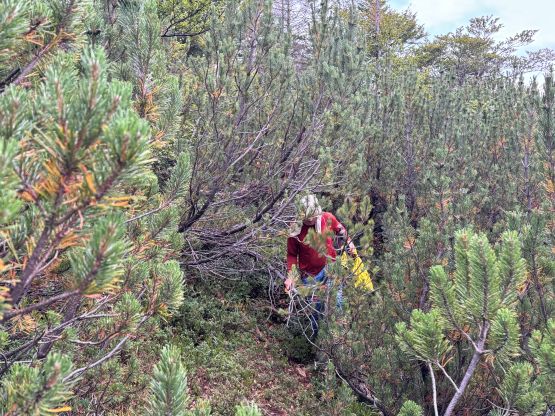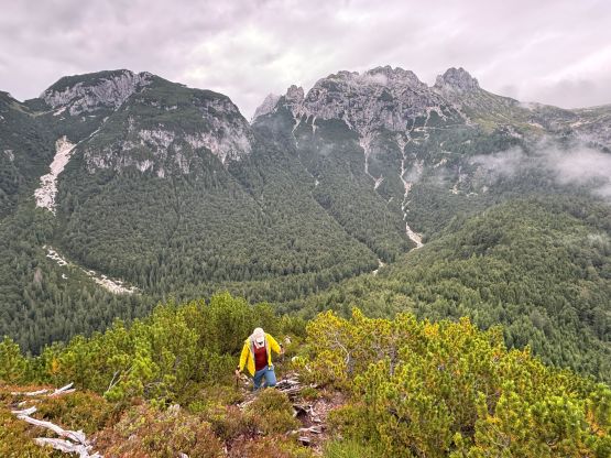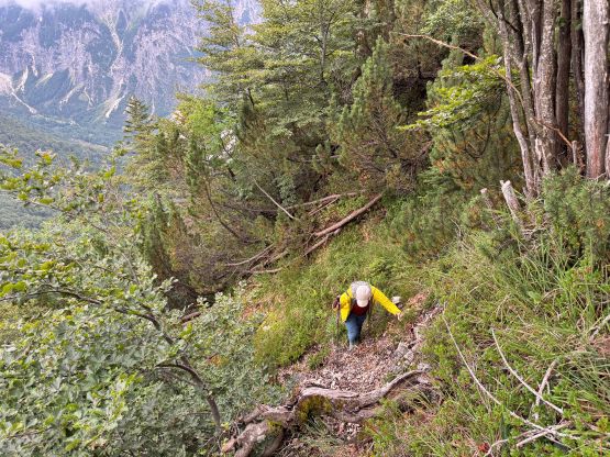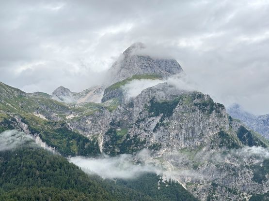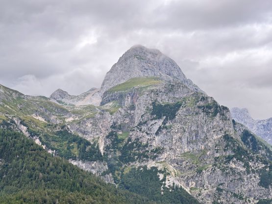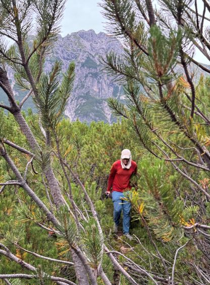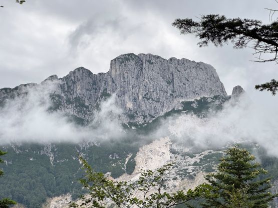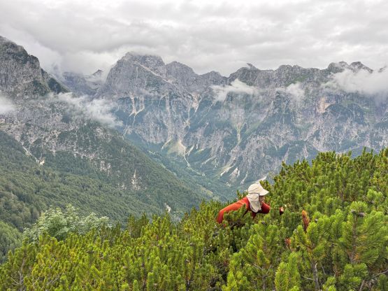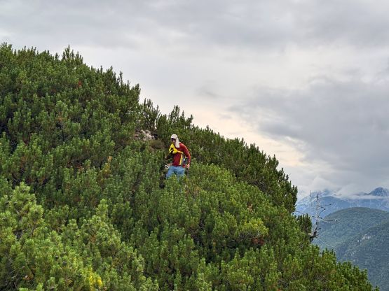 Planja boasts over 100 m prominence above the saddle with Monte Màngart, on the Slovenian side of the border but not far from Italy. This is a jungle peak that used to have a trail to the top. This trail is labelled on the Gaia map (hence why Adam and I went for it), but is unofficial and not maintained. There are several nicer viewpoints along the way but the true summit itself isn’t the prettiest so very few people actually venture that far up. Adam and I found ourselves camping right at the Planja/Mangart saddle and we still had energy to spare. Adam noticed this objective on his Peakbagger app while I suggested that we should tag it at 7 pm expecting a trail to the top.