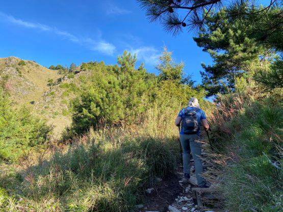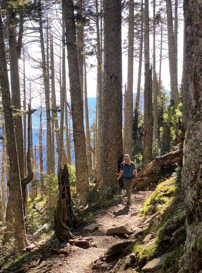 Adam exiting the forest with more rugged peaks behind