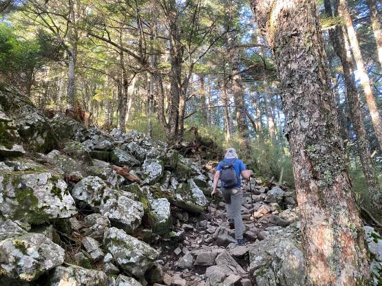 The trail enters the forest and there are a ton of rocks