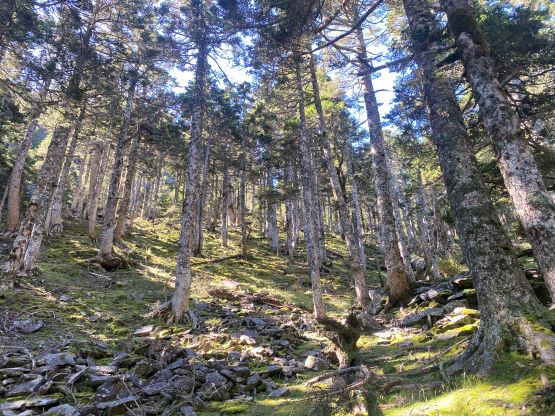 The next stage of the route involves mostly traversing on flat and undulating terrain, for several kilometers to Sanliujiu (396) Lodge / 三六九山庄, the main lodge on Xueshan’s routes. To spend a night in this lodge one does need to make a reservation and the reservation can be difficult, if not impossible in summer. Thankfully Adam and I were fit enough to do this peak in one day. The trail actually traverses high above the lodge such that we did not have to actually pay a visit inside. We passed several groups of Taiwanese on the steep section above 369 Lodge before entering the “black forest”. This piece of forest is the typical type that we have in Washington and B.C. with mostly tall trees and hardly any underbrush and I do think there has snow coverage in winter. I did not find it to be spectacular at all, but apparently it’s quite a thing for the Taiwanese. After exiting the “black forest” we came to the treeline zone in the valley NE of the main summit. The ascent onto the NE Ridge of the main summit was long and foreshortened, but I made quick work and got there in a timely manner before the clouds came.