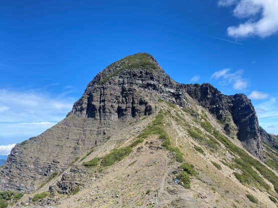 Descending the east peak with the main peak ahead