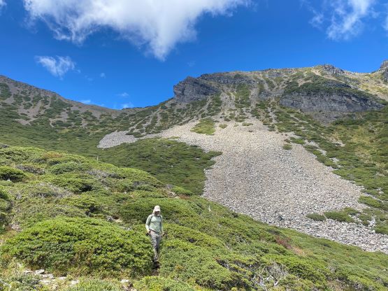 Adam plodding up the steeper terrain above that hut