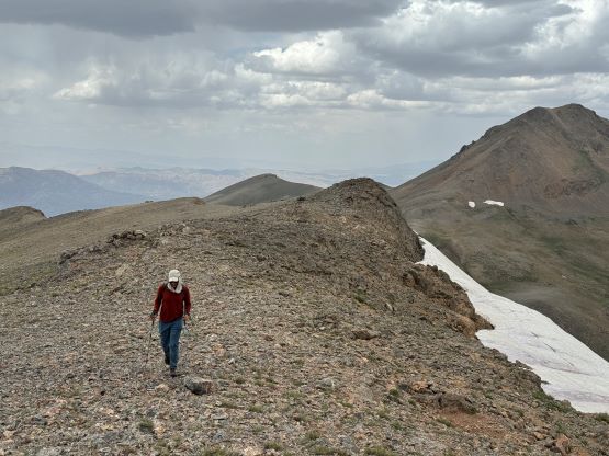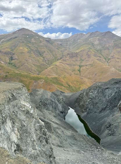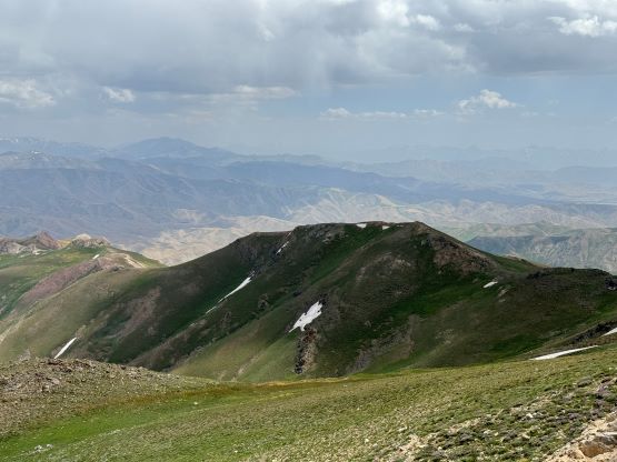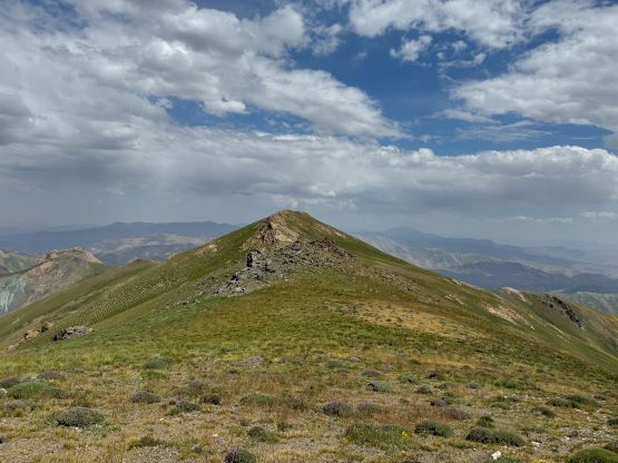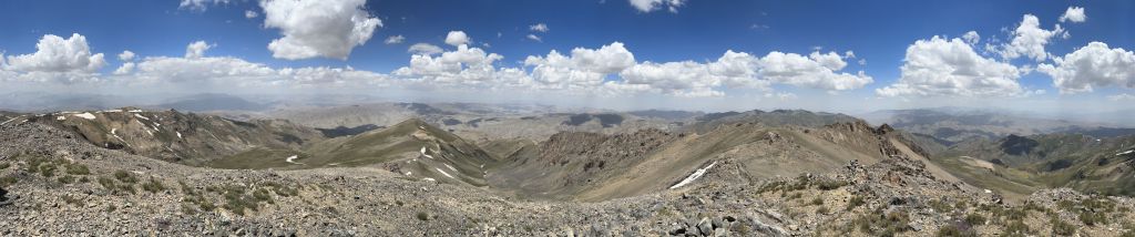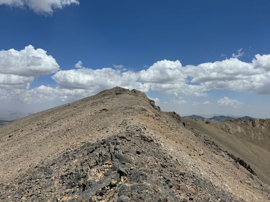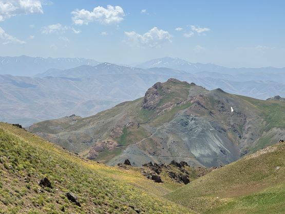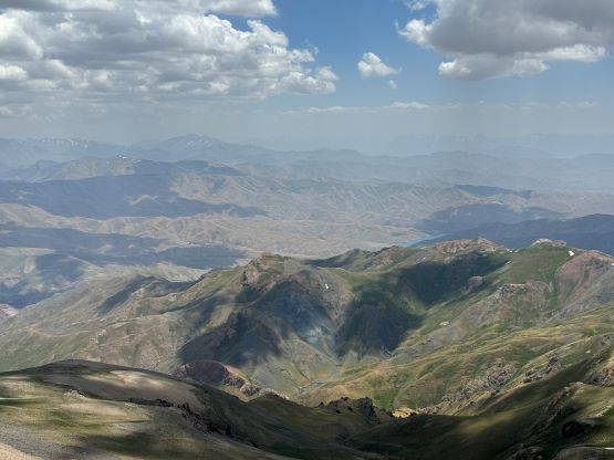 Our guide Recep showed up on the summit about 5 minutes behind me and told Adam and I that if we wanted that bonus peak we should get going soon. We did so, and crossed path with the rest of the team on the upper SW Ridge. I led us jogging down the chossy terrain followed by some long stretches of flats to the saddle between the main peak and the south summit. That south (bonus) peak boasts about 150 m prominence and our local guide also passed on its original (local) name, Dola Koxe. The ascent went without event and Adam and I took a long break on the summit. There was cell reception on both summits so we were able to communicate. The others decided to not go down to the saddle so we replied that we would also descend a different route. Adam suggested to make a gigantic loop to those mining roads. This would double the distance but the terrain appeared mostly friendly so I agreed.