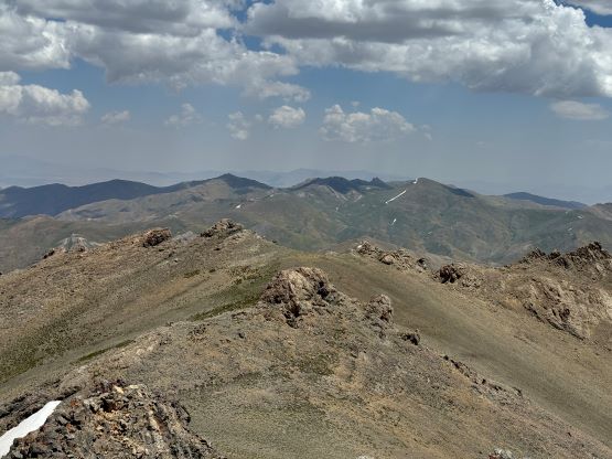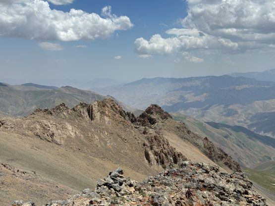 Our guide Recep showed up on the summit about 5 minutes behind me and told Adam and I that if we wanted that bonus peak we should get going soon. We did so, and crossed path with the rest of the team on the upper SW Ridge. I led us jogging down the chossy terrain followed by some long stretches of flats to the saddle between the main peak and the south summit. That south (bonus) peak boasts about 150 m prominence and our local guide also passed on its original (local) name, Dola Koxe. The ascent went without event and Adam and I took a long break on the summit. There was cell reception on both summits so we were able to communicate. The others decided to not go down to the saddle so we replied that we would also descend a different route. Adam suggested to make a gigantic loop to those mining roads. This would double the distance but the terrain appeared mostly friendly so I agreed.