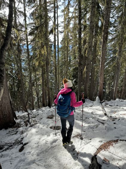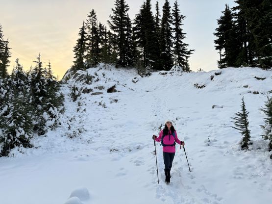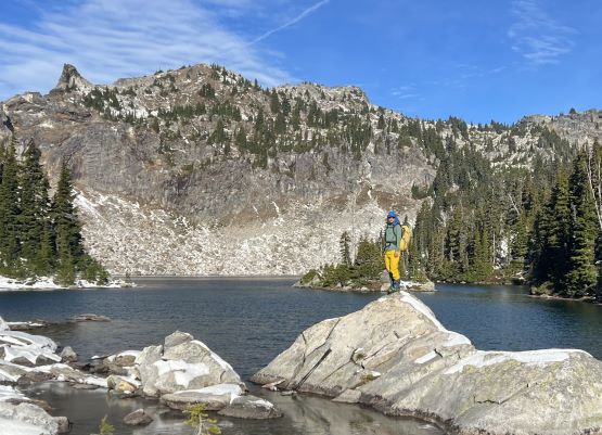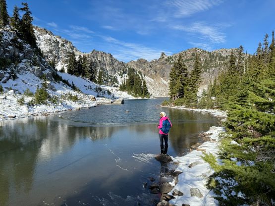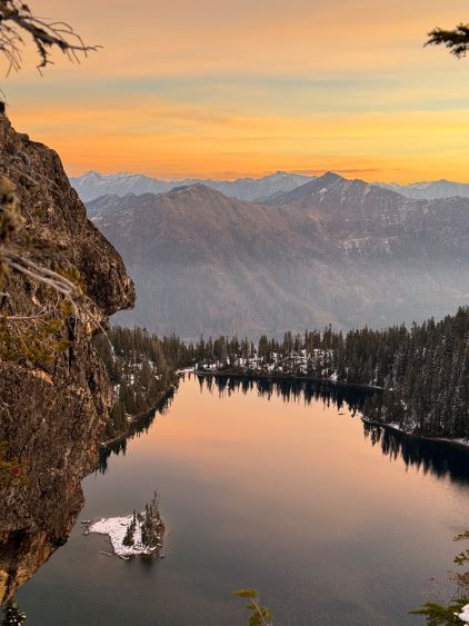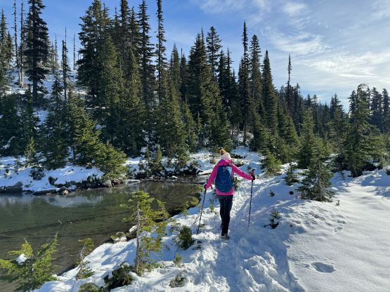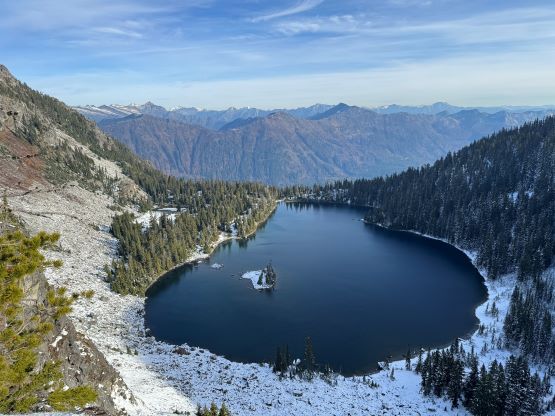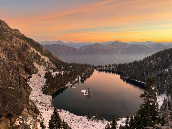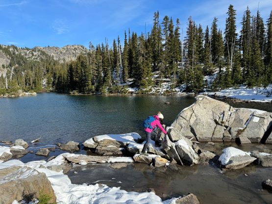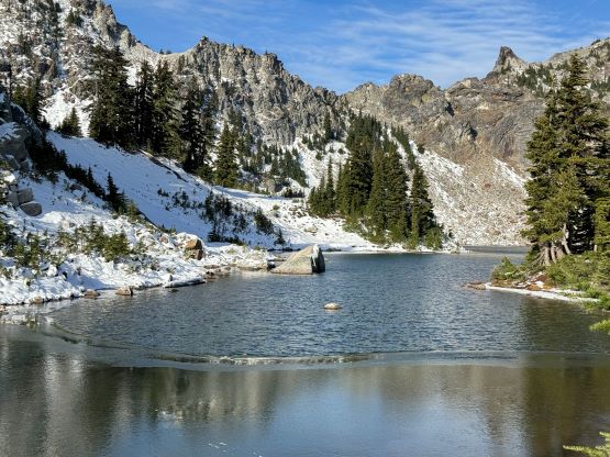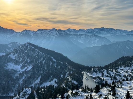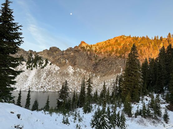 To descend we picked up the correct trail and dropped into the south side bowl without an issue. We also picked up the set of tracks and quickly rejoined our own tracks. We then made a dash down to the ridge separating the two lakes and took a few more breaks for photos. The wind had finally died down that we eventually opted to take a proper break for food, before resuming the descent down to the outflow of Minotaur Lake. I had thought about to ascend the two unofficially-named bumps but decided against that. Instead, we slowed down and did some photography on the shore of this lake. The rest of the descent back to the trail-head was tedious and monotonous, but with chatting it wasn’t too bad. I also somehow managed to stay awake for the entire drive homewards, with one stop in Bellingham for lunch. I eventually got back home in time for work.