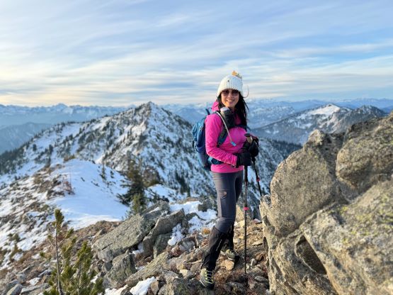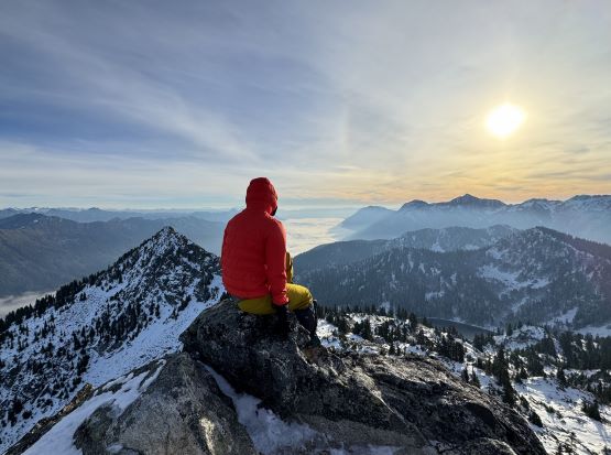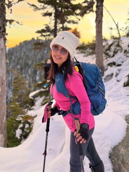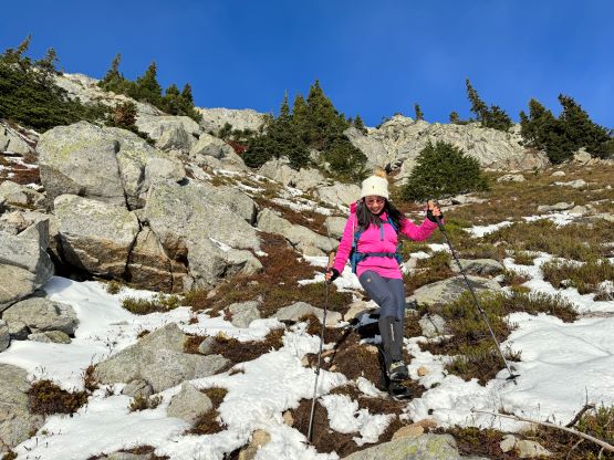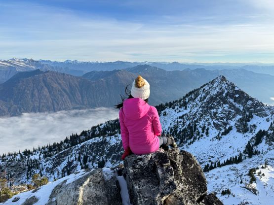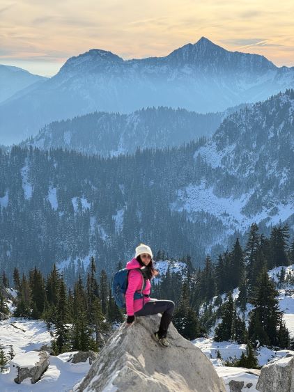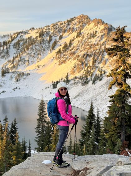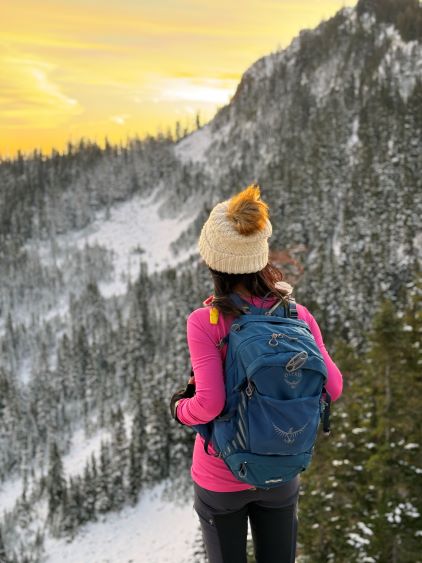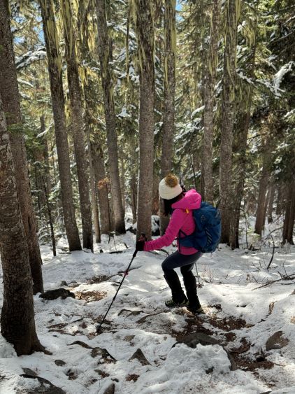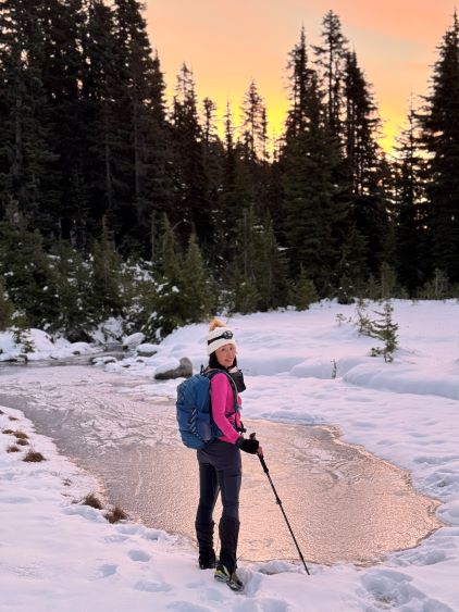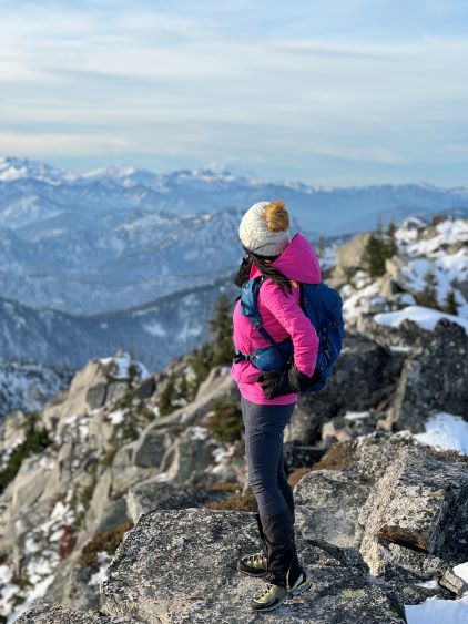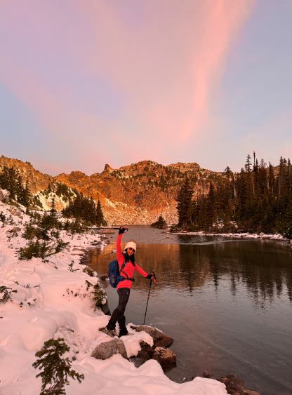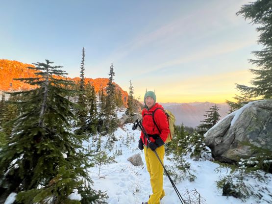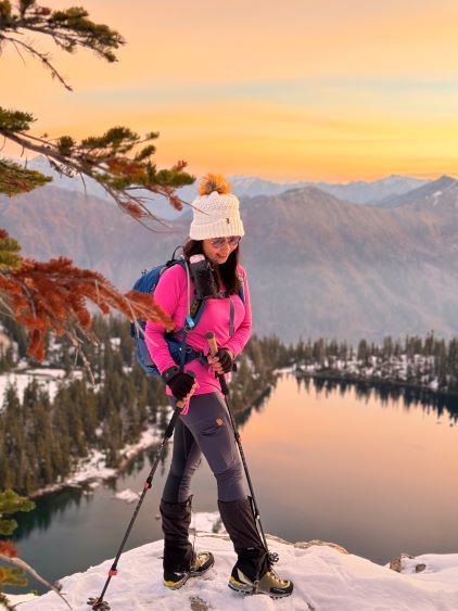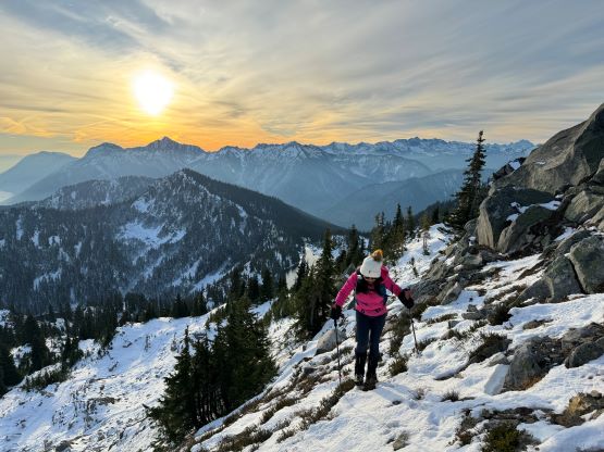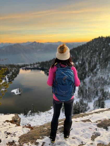 Both Kate and I opted to wear Trango Tech mountaineering boots. I had suggested Kate to purchase a pair of the Trangos to be better prepared for the winter and the general off-trail scrambling on rough terrain, and this would be the perfect trip to break them in even though the condition was simple enough that wearing the hiking boots would be totally fine. I too decided to wear the mountaineering boots for simplicity. The trail had become steep and icy after gaining a few hundred meters elevation but the microspikes stayed in the backpacks. The horizon had become bright enough to stow the head-lamps by the time we reached the snow-covered meadows under Minotaur Lake, and we subsequently watched the perfect dawn/sunrise horizon from the scenic ridge between Minotaur Lake and Theseus Lake. The views were beyond our expectation that we immediately started taking tens, if not hundreds of photos.