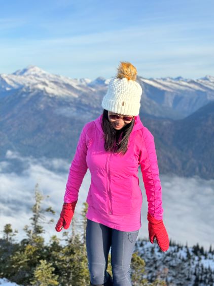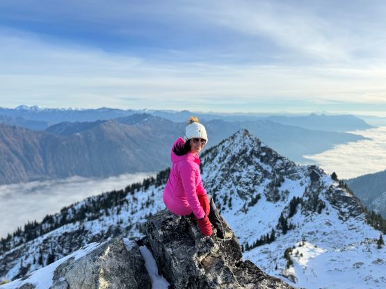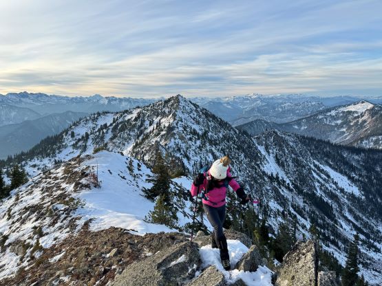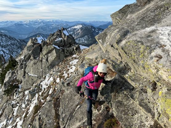 The only downside was the cold winds which kept us moving. We picked up the set of tracks heading upward into the bowl/basin under the south slopes of Labyrinth Mtn., but then took the wrong set of footprints ascending onto the jagged south ridge. The footprints terminated at the south ridge and it’s apparent that whoever made this set of tracks turned around or merely aimed to explore the ridge. Turning around would not be an option for us as attaining the true summit would be mandatory, so we scrambled northwards and dealt with a series of 3rd class steps, sometimes tricky with the fresh snow. I had given my gloves to Kate and decided to just scramble in bare hands, and I became quite cold when I eventually reached the summit. Unfortunately the cold winds meant we couldn’t stay too long up there.