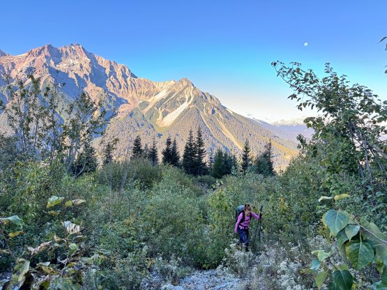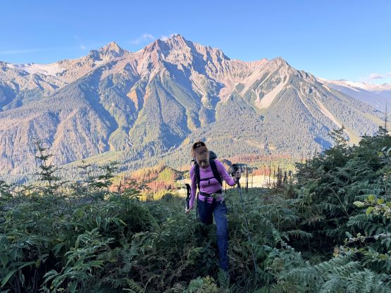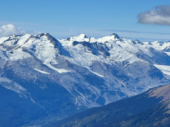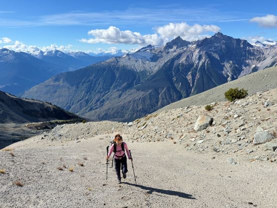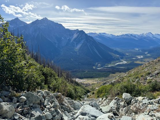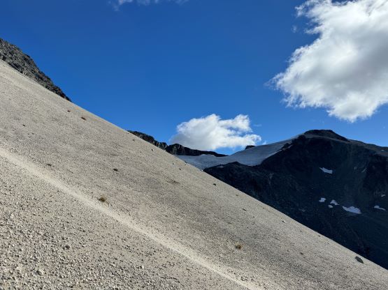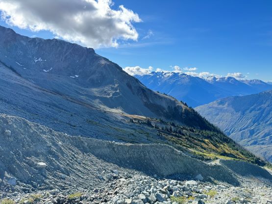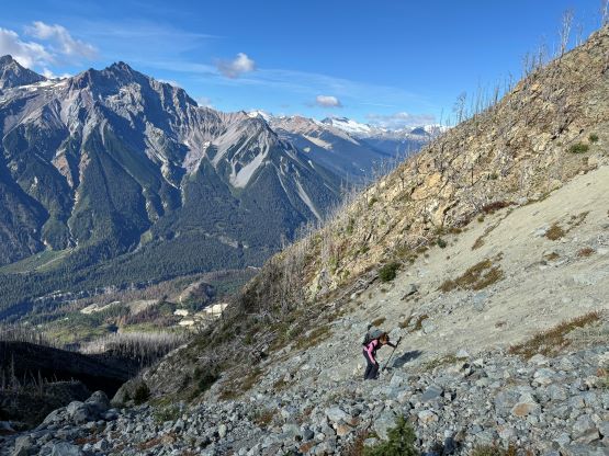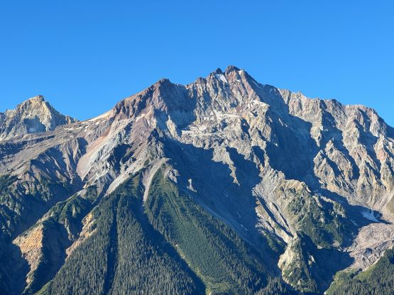 On the descent I initially thought about to make things on purposely hard as right off the bat I led us down-climbing a committed 4th class variation, but then I became tired and wanted to get off this mountain as quickly as possible. I then did the route-finding more carefully and bypassed the rest of the challenging steps so the south ridge would indeed go at “class 3” if one wants it to be in that realm. We then enjoyed a furious plunge down that pumice field but then we had to face that moraine crest as well as the tedious and loose terrain lower down. The rest of the descent into and then through the gully was far from enjoyable and we took numerous breaks along the way. I had opted to wear trail-runners for the entire day and they were slightly undertooled for this type of terrain on the descent. It was loose even by Rockies standard and at times the microwave sized boulders could come loose upon touching. I also had to regularly dump choss out of my shoes as the tiny built-in gaitors were of no use. Eventually I spotted a reasonable place to leave the gully and led us traversing into the burnt but open forest. To get out of the gully required a band of intense bushwhacking but that was short-lived. The rest of the descent was rather enjoyable but again we had to deal with the sands in our shoes. This turned out to be one of the filthiest routes I’ve done in SW BC with infinite amount of choss (of various types), but the technical difficulty was at most the upper end of “class 3”. The access does require a beefy vehicle but the approach is “short” especially by this area’s standard. Our round trip time was 8.5 hours including all of the breaks. We then drove back to Pemberton for a well-deserved Thai dinner, and then drove home by 10:30 pm. Perhaps the most memorable sighting of the day was a monstrous sized grizzly in the middle of a farmland in Pemberton Valley.
