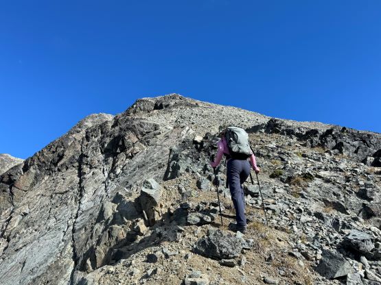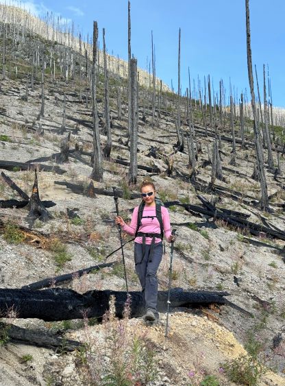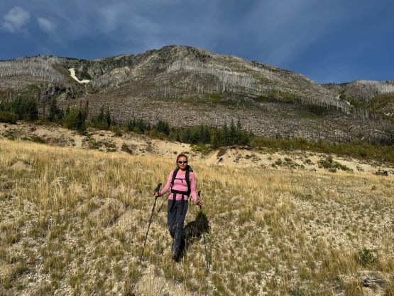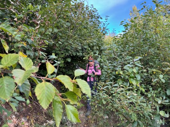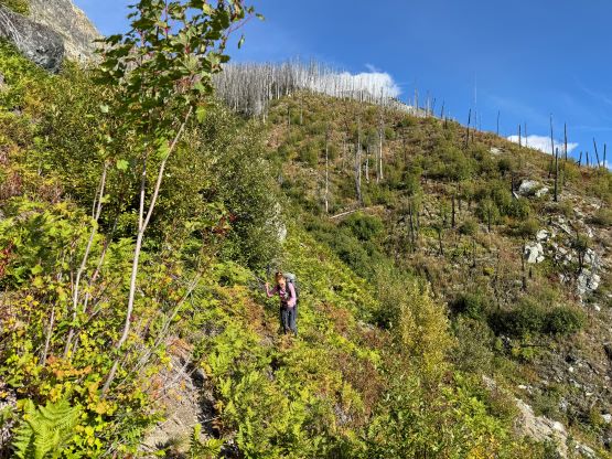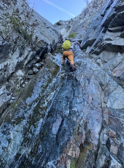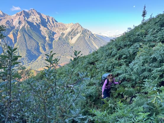 The weather was supposed to be good for the entire day so there was no need to rush. I decided for us to sleep in until 7 am and we did not start hiking until 8 am after the usual morning car-camping routine. One benefit for driving this far into the remoteness was the ability to leave the tent unattained for the course of the day. The sleeping bags would be left there to dry while we were out hiking, and there’s no need to worry about theft activities. Until this point I was still not 100% clear where exactly Dean went but now with daylight I could finally make out his route(s). I decided to aim for his descent gully but take our own variation and do our own route-finding as in the microscopic scale we needed no assistance in route-finding. We firstly followed this overgrown road to the open (but gated, not accessible) road above and beyond the mine site, and then continued the eastwards bearing after passing the road’s end. The forest had been burnt in the recent time so the cross-country travel was straightforward with minimal bushwhacking. The in situ decision was made to traverse into that gully as quickly as possible but in retrospect it would be easier to plod up this burnt forest for a few hundred vertical meters and intersect the gully much higher up. The lower gully had at least two 4th class steps that put our scrambling skills in test. The lower one was wet and down-sloping whereas the second one was loose even by Rockies standard. I promised Erica that we would find another route on the way down.